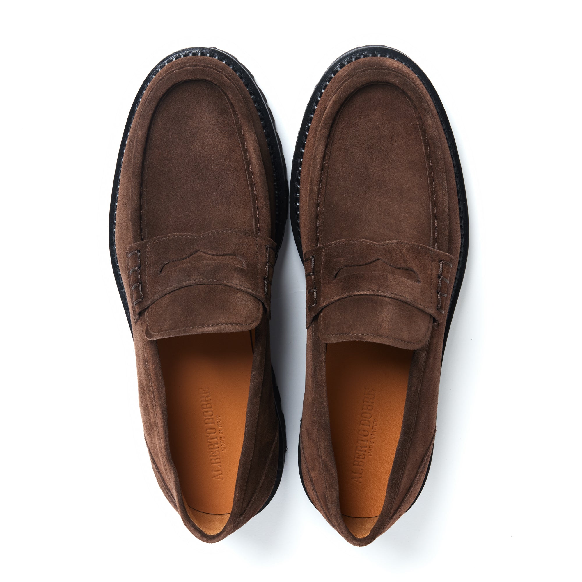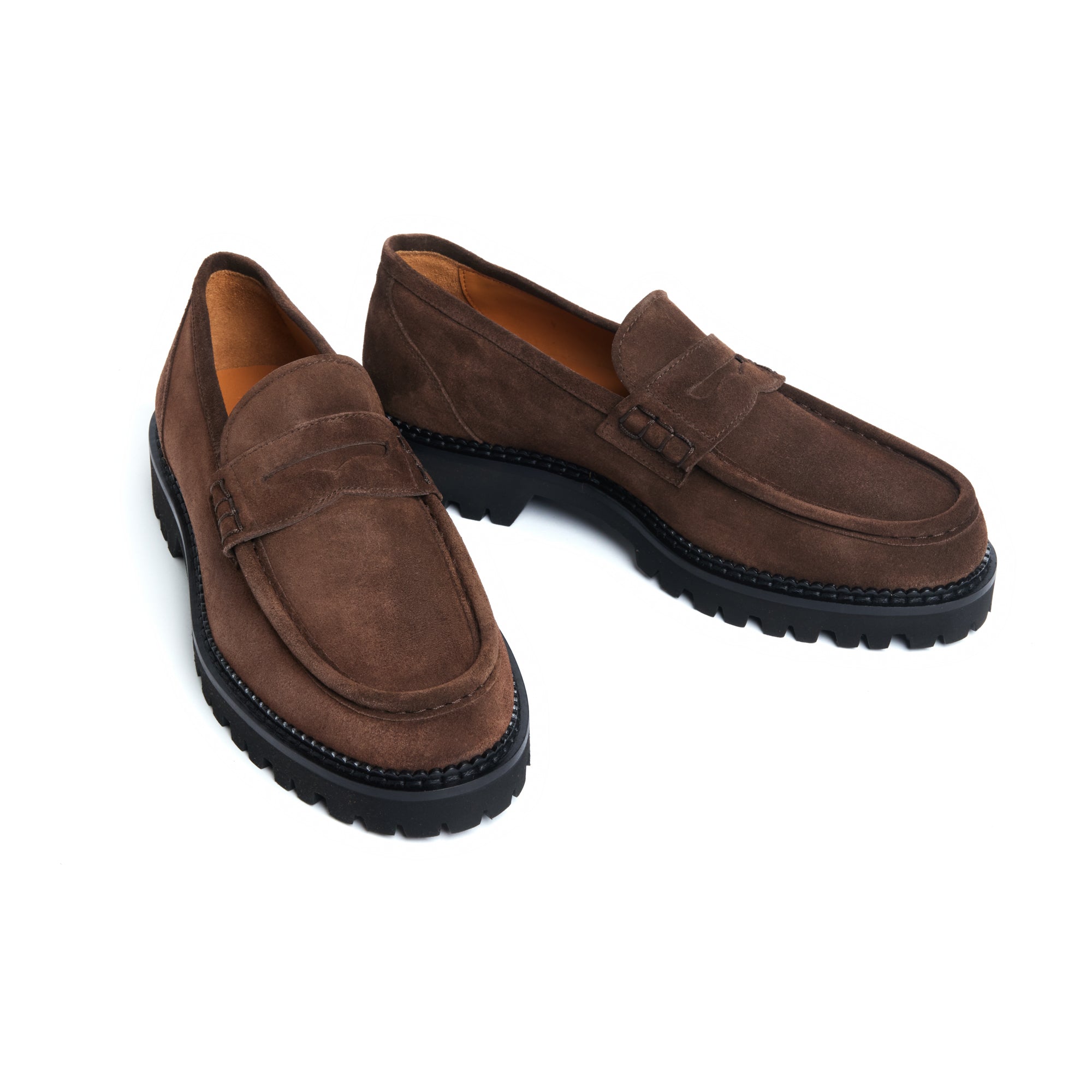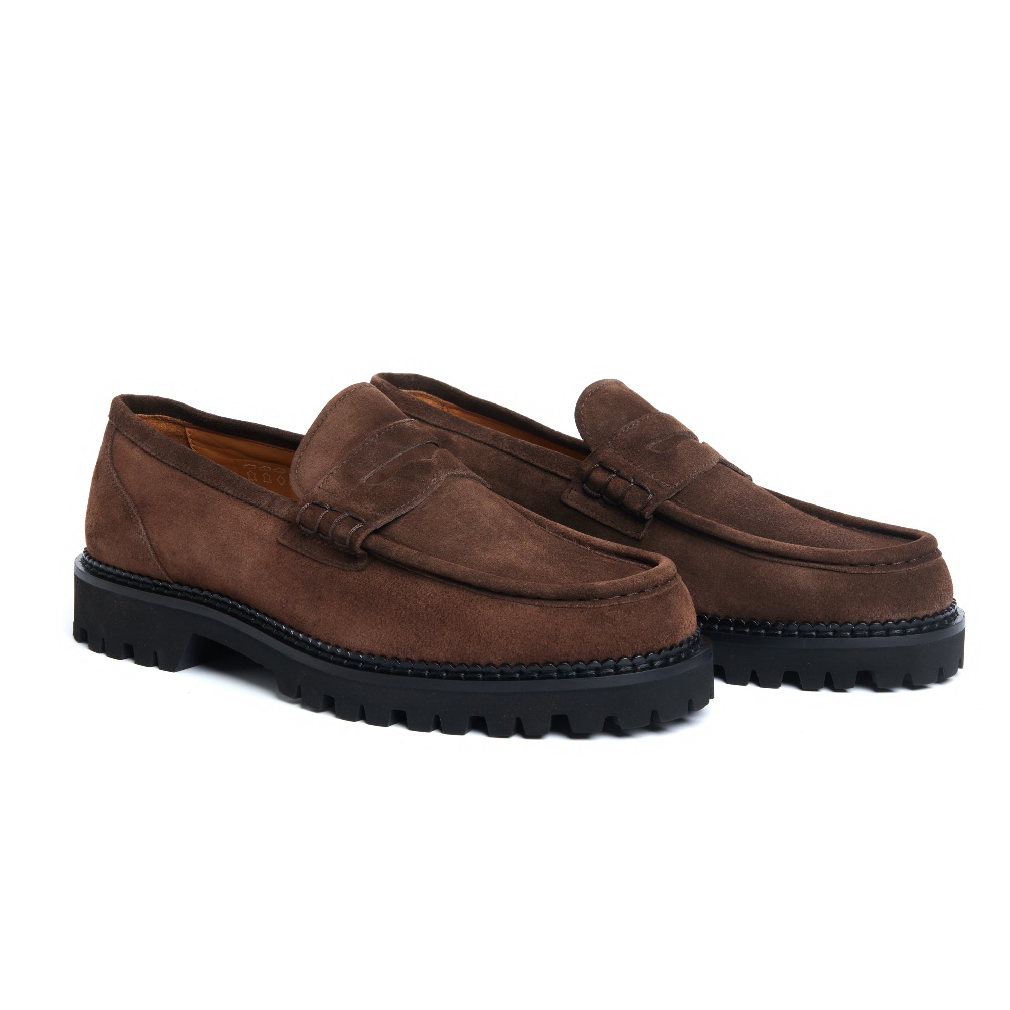 Acești loafers din piele întoarsă maro combină rafinamentul clasic cu elemente moderne, oferind o alegere versatilă pentru bărbatul contemporan. Talpa chunky, mai robustă și mai înaltă decât la modelele tradiționale, adaugă un aer impunător cu un twist modern.