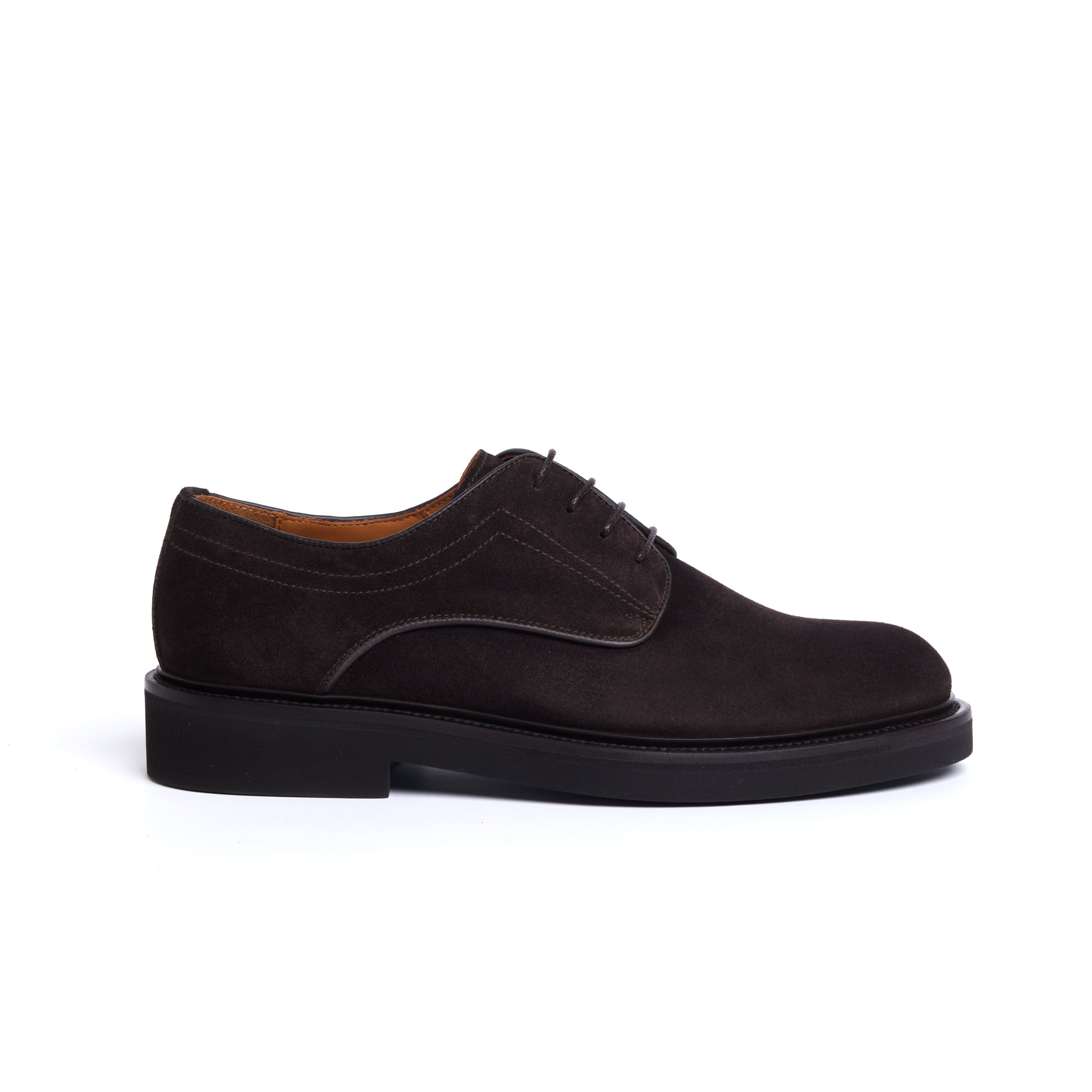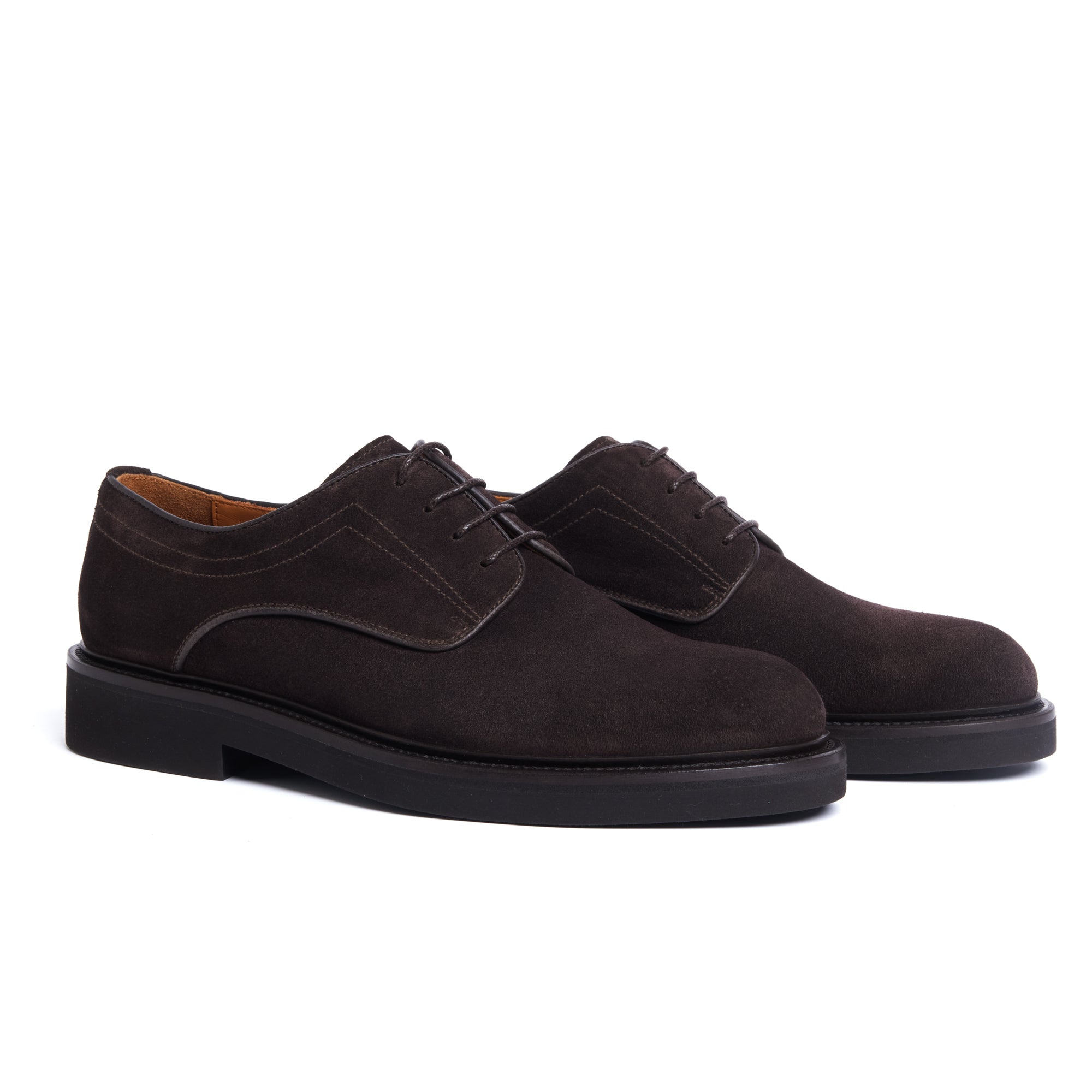 Pantofii Derby din piele întoarsă maro îmbină armonios designul clasic cu elemente contemporane, fiind o alegere perfectă pentru orice bărbat care dorește să adauge un plus de stil și rafinament ținutelor sale. Talpa chunky, înaltă și confortabilă, completează acest model cu un aer modern și funcțional.