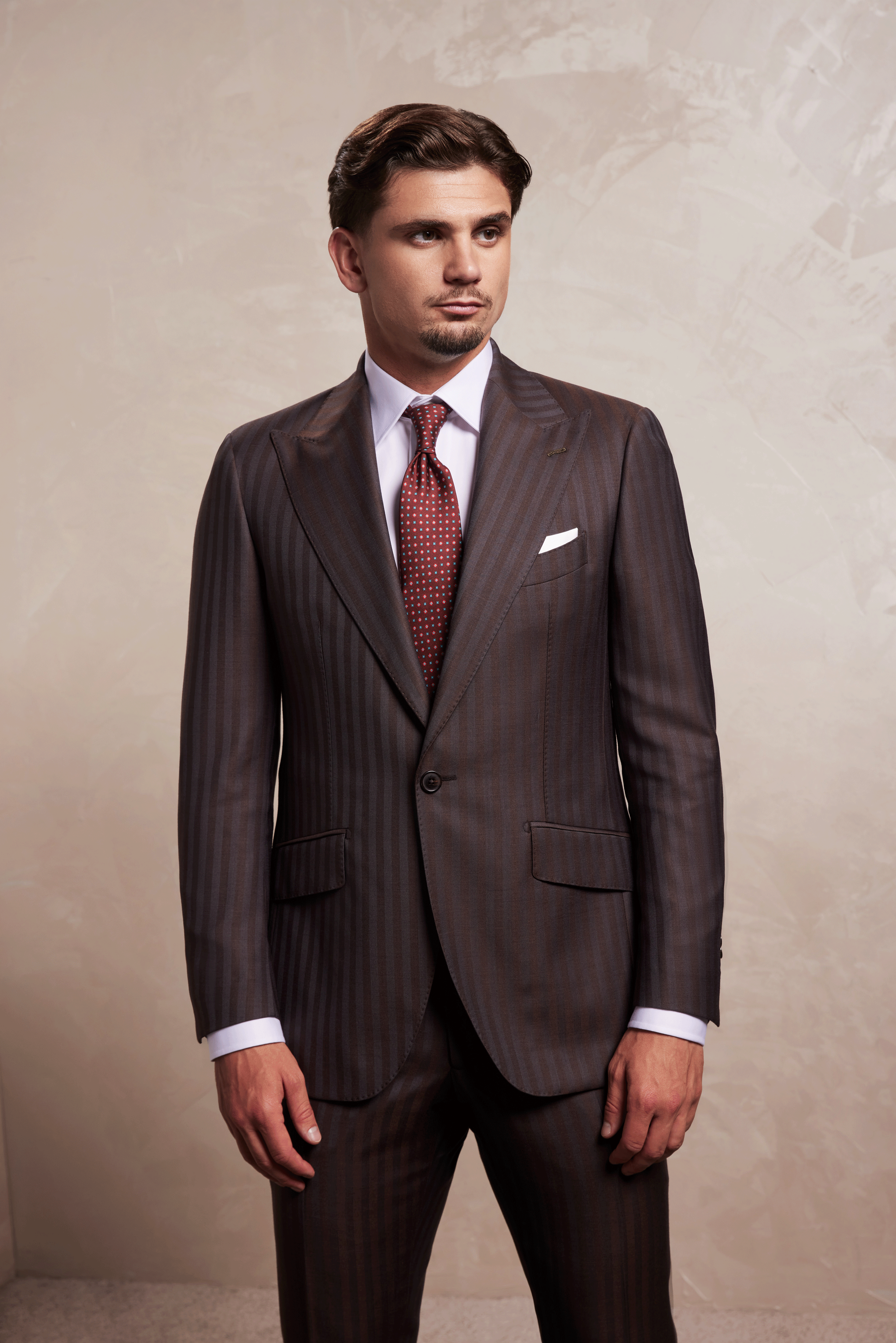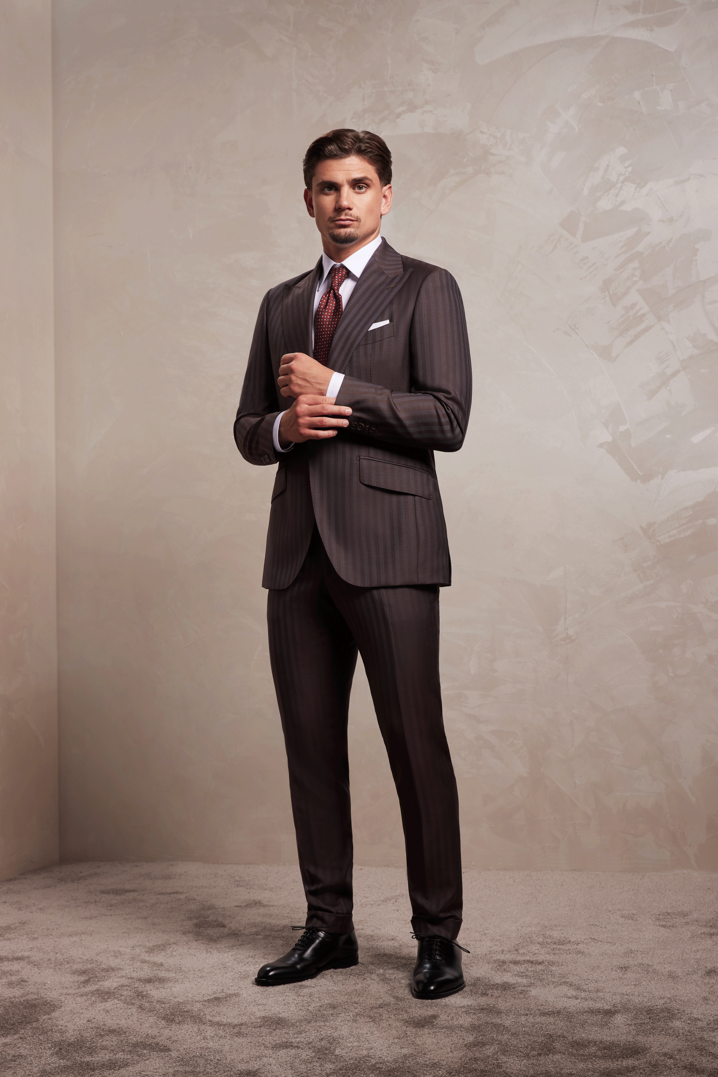 Descoperiți esența stilului personal cu acest costum remarcabil. Croit dintr-o stofă unică Drago Super 130s lână, cu designul și compoziția stabilite de Dobre Tailoring și realizată de Drago. Această colaborare oferă o exclusivitate absolută și o calitate excepțională. Nuanța profundă de maro, îmbogățită cu un model de dungi, transformă acest costum într-o piesă centrală a garderobei masculine.