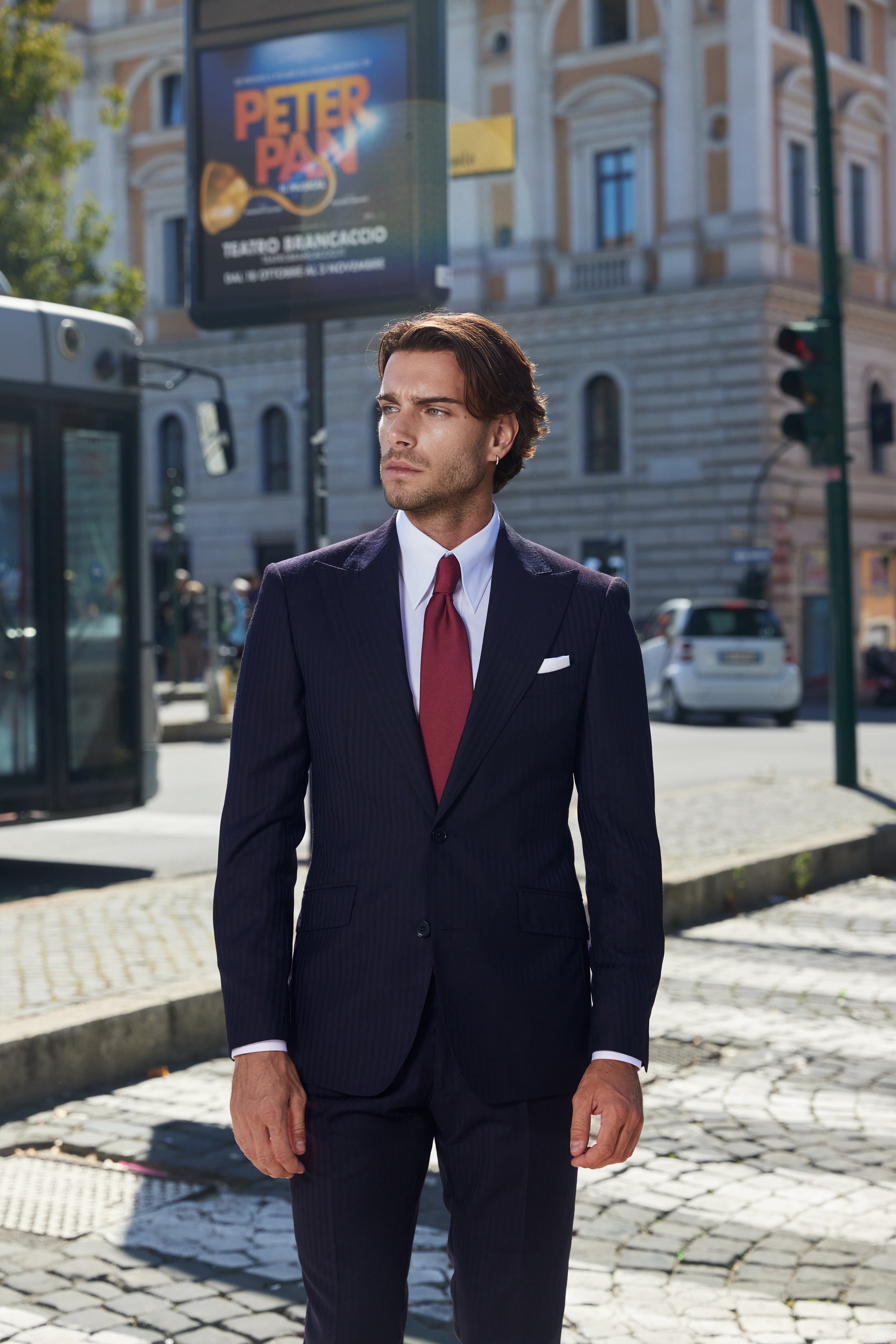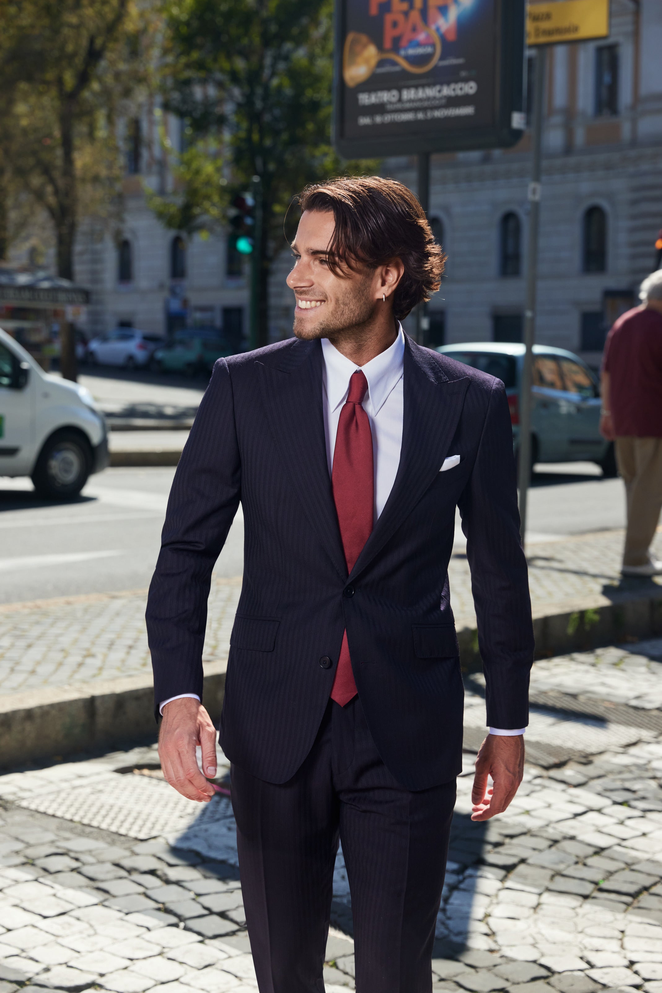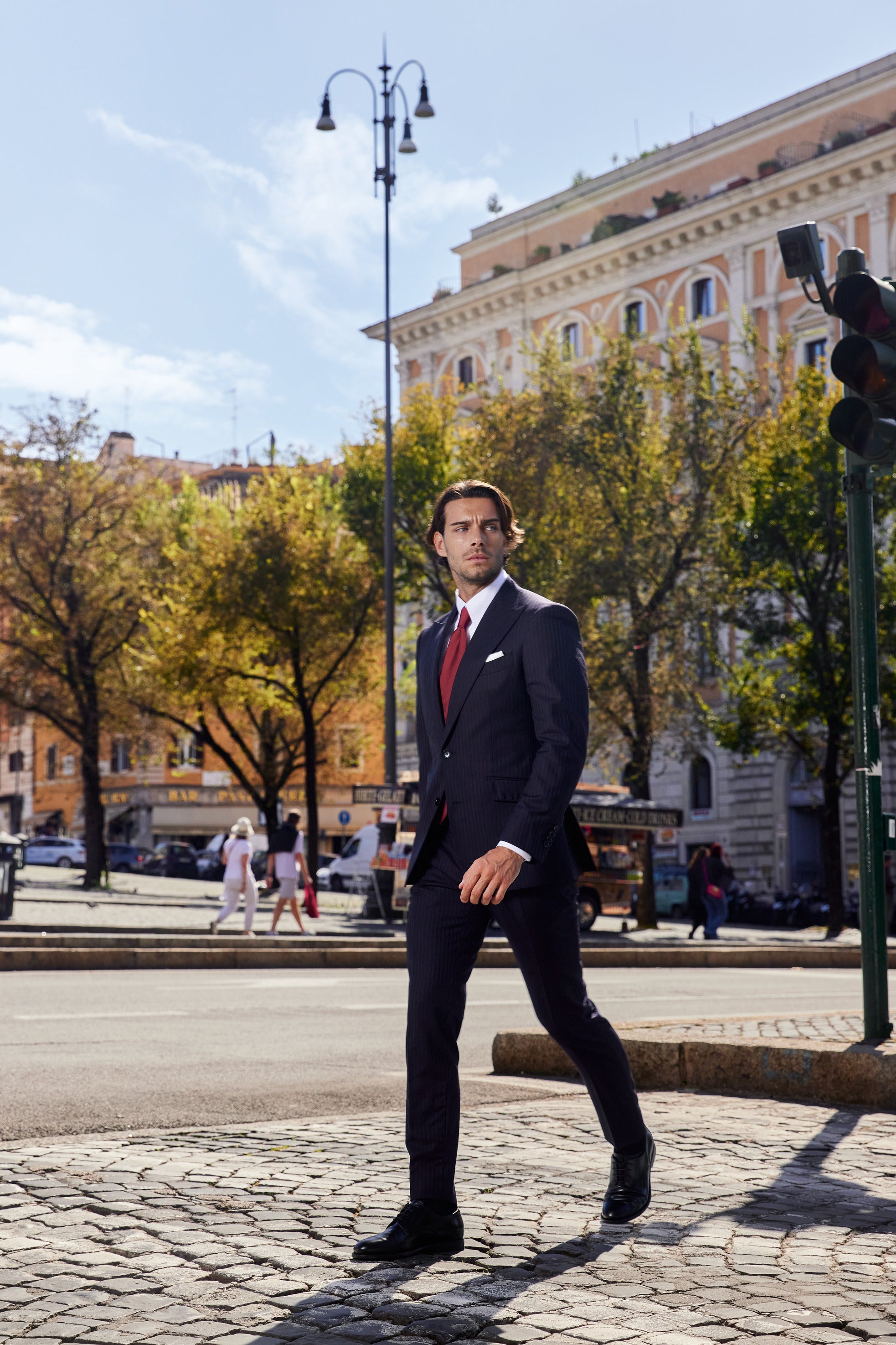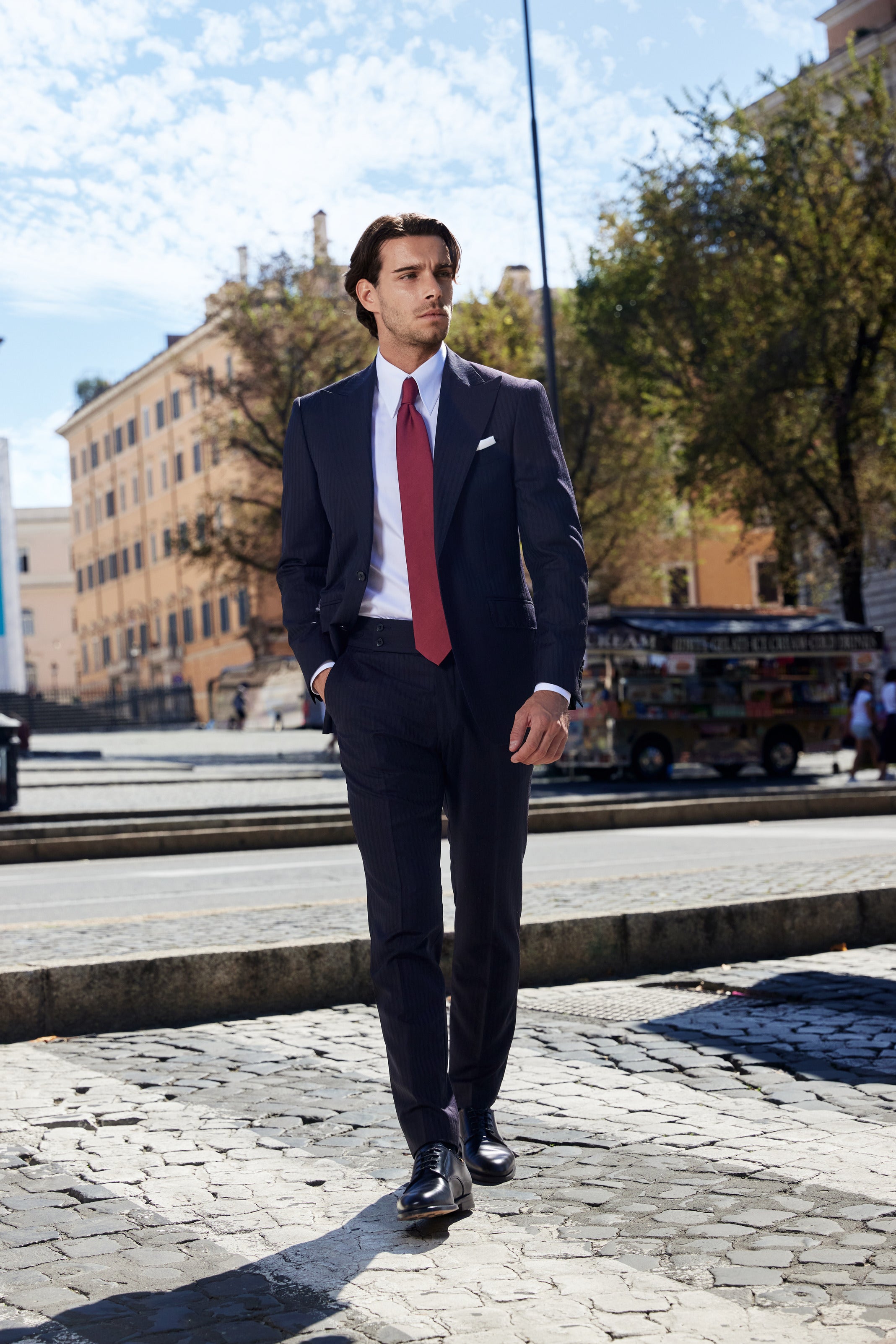 Acest costum business navy, cu dungi subtile, este confecționat din țesătura premium Ermenegildo Zegna, 100% lână Superfine Australiană, oferind o textură fină și un confort deosebit. Designul său single-breasted cu rever ascuțit adaugă o notă de eleganță clasică, ideală pentru întâlniri de afaceri și evenimente formale. Acest costum este alegerea perfectă pentru un look profesional, rafinat și impecabil.