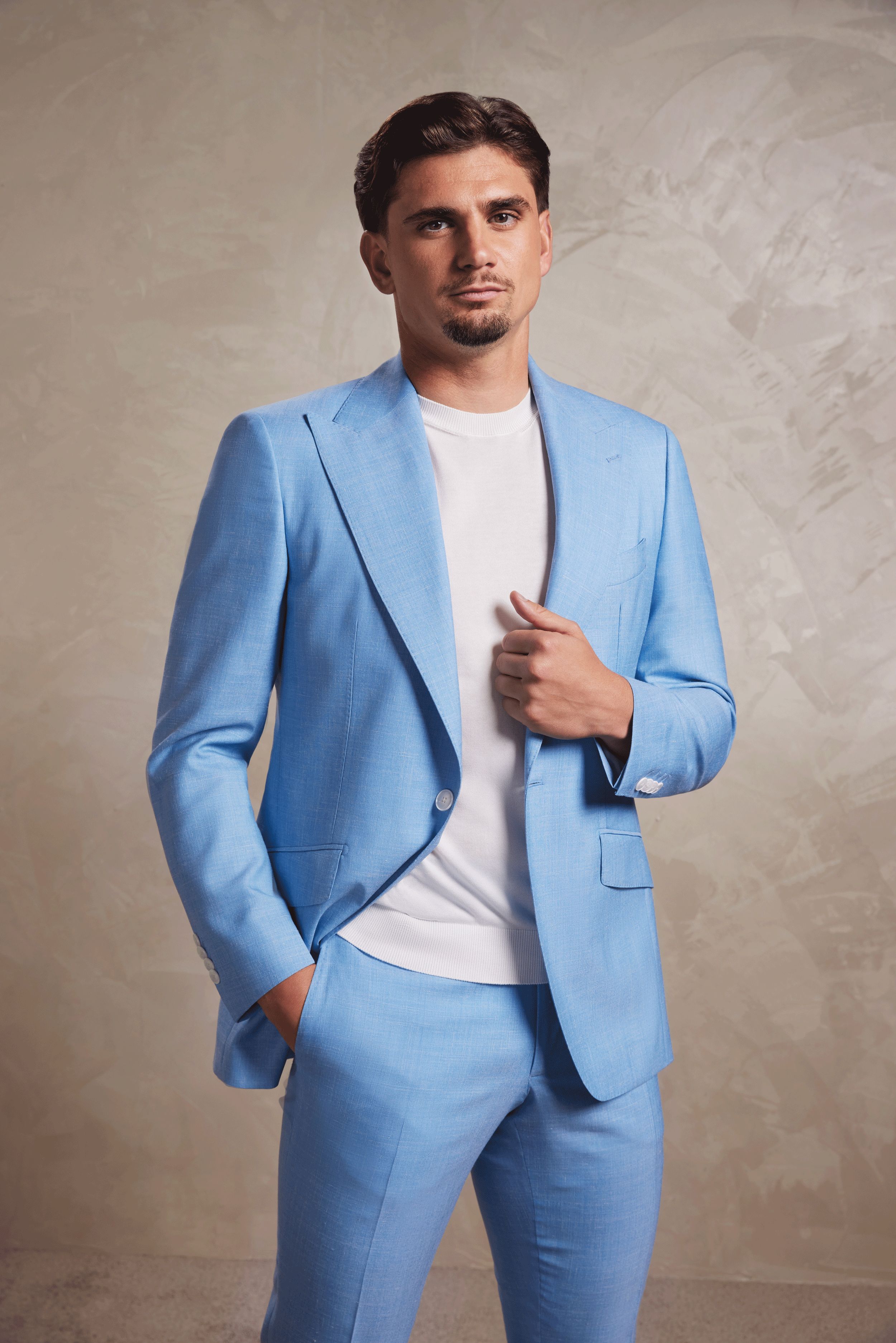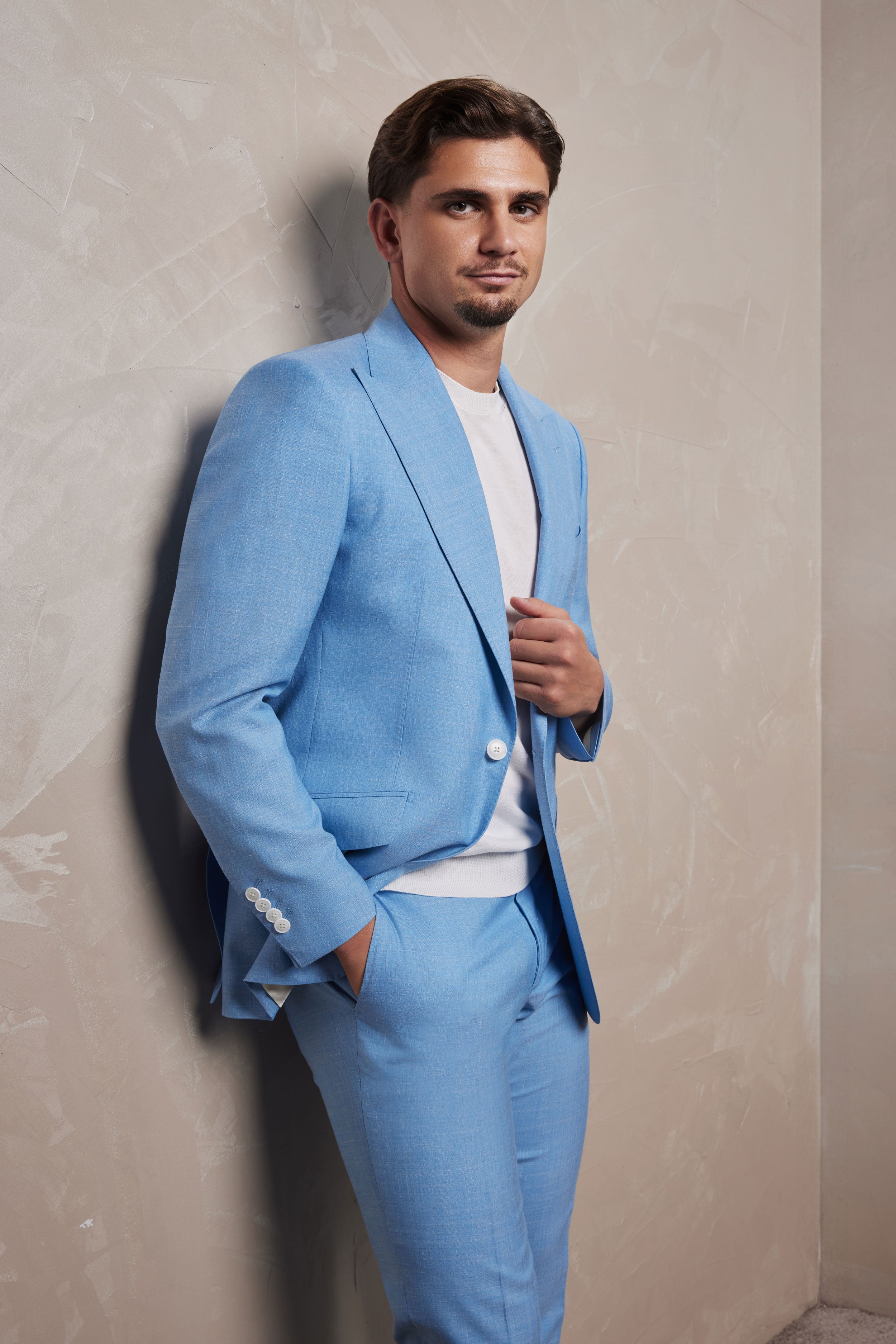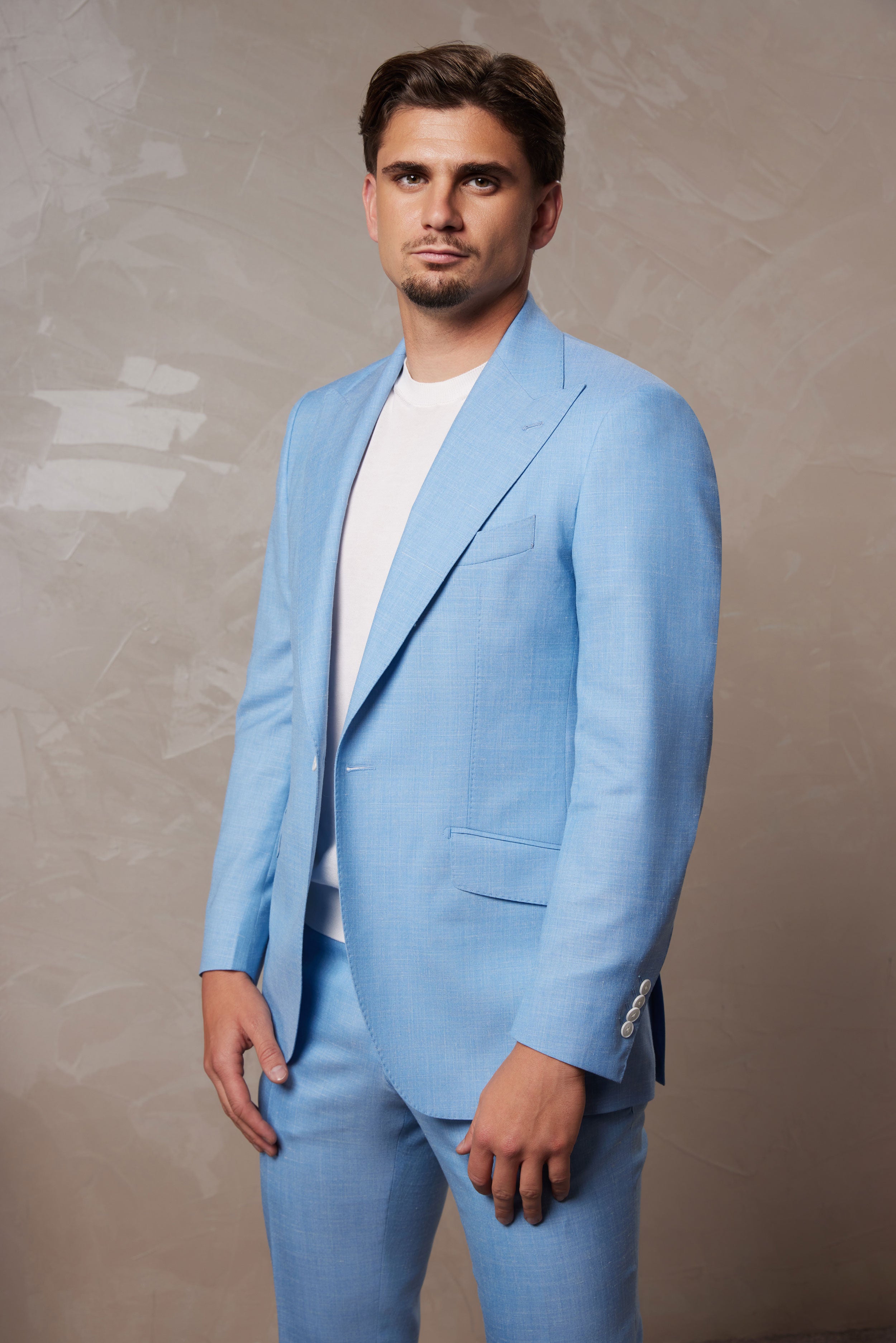 Croit dintr-o stofă unică Drago, cu designul și compoziția stabilite de Dobre Tailoring compoziția de in, mătase și lână oferă o textură remarcabilă, o lejeritate inegalabilă și o cădere impecabilă. Materialul, un amestec prețios de lână, in și mătase, oferă o textură incredibil de fină, o fluiditate impecabilă și o respirabilitate excelentă, ideală pentru sezoanele calde. Nuanța vibrantă și luminoasă de albastru emană o eleganță modernă și proaspătă, perfectă pentru orice ocazie specială sau eveniment de zi.