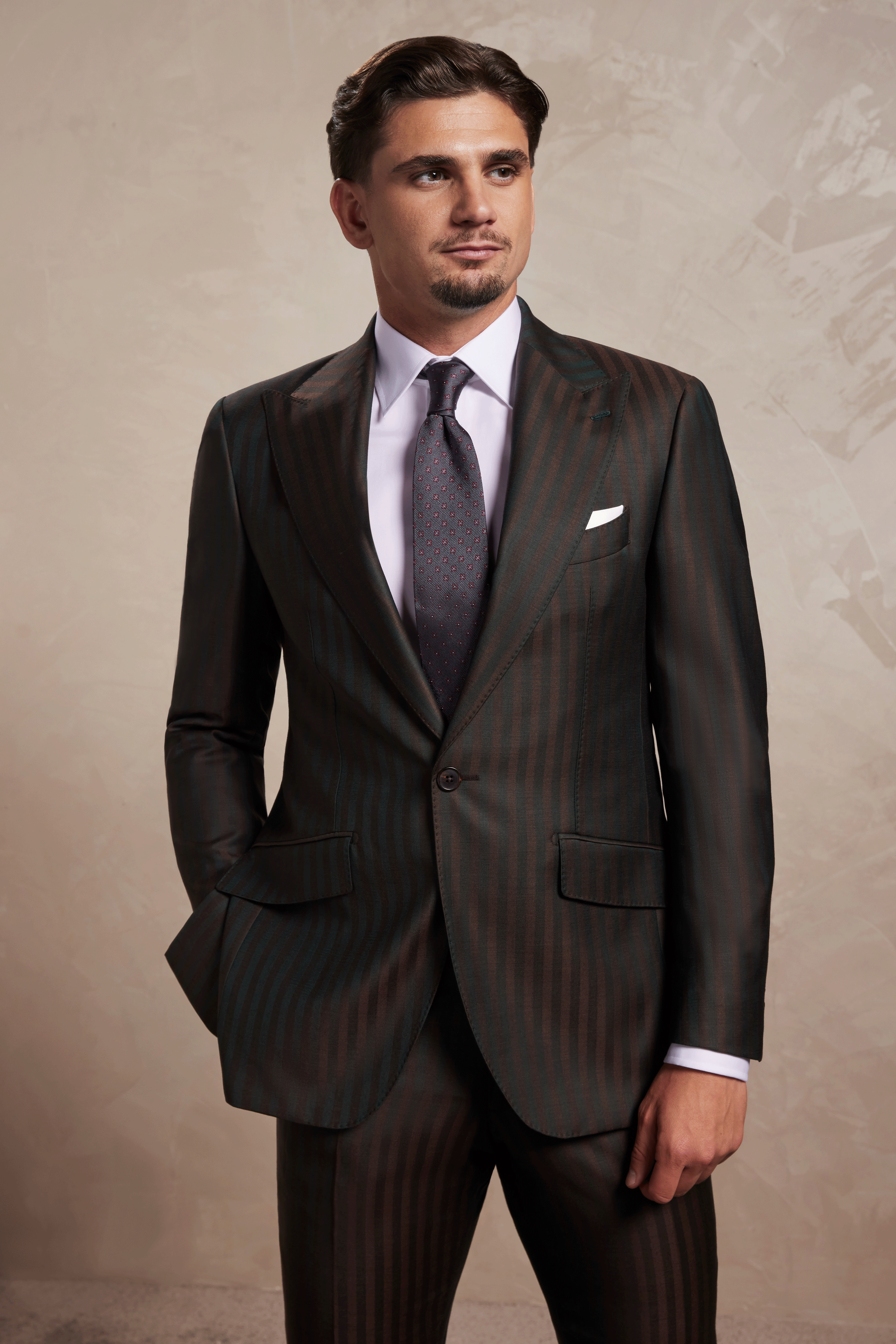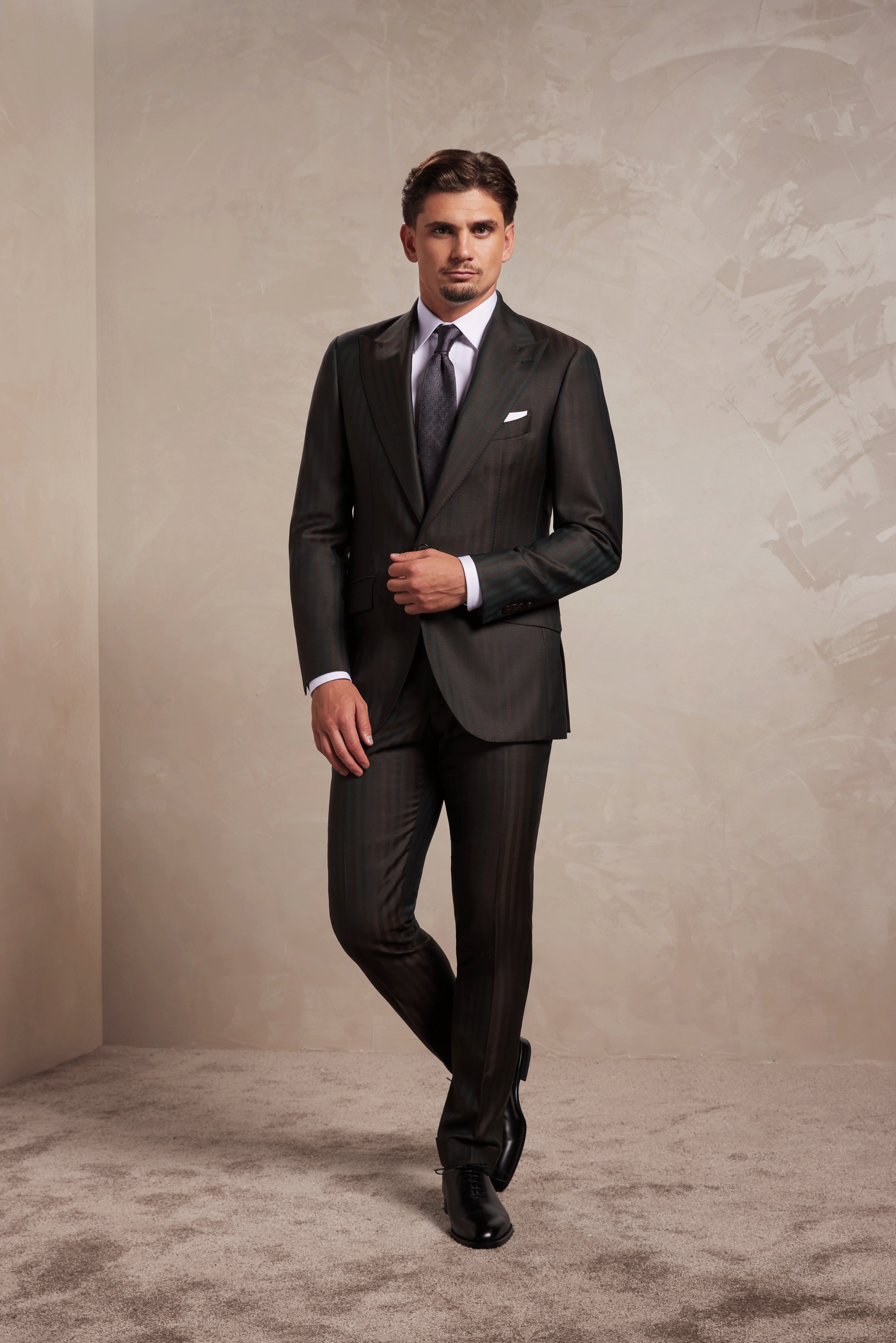 Descoperiți rafinamentul și stilul cu acest costum remarcabil, confecționat din stofă de excepție Drago Super 130s lână. Croit dintr-o stofă unică Drago Super 130s lână, cu designul și compoziția stabilite de Dobre Tailoring și realizată de Drago. Această colaborare oferă o exclusivitate absolută și o calitate excepțională. Paleta cromatică inedită, de maro cu dungi verzi, îl transformă într-o piesă vestimentară de impact, ideală pentru o prezență memorabilă.