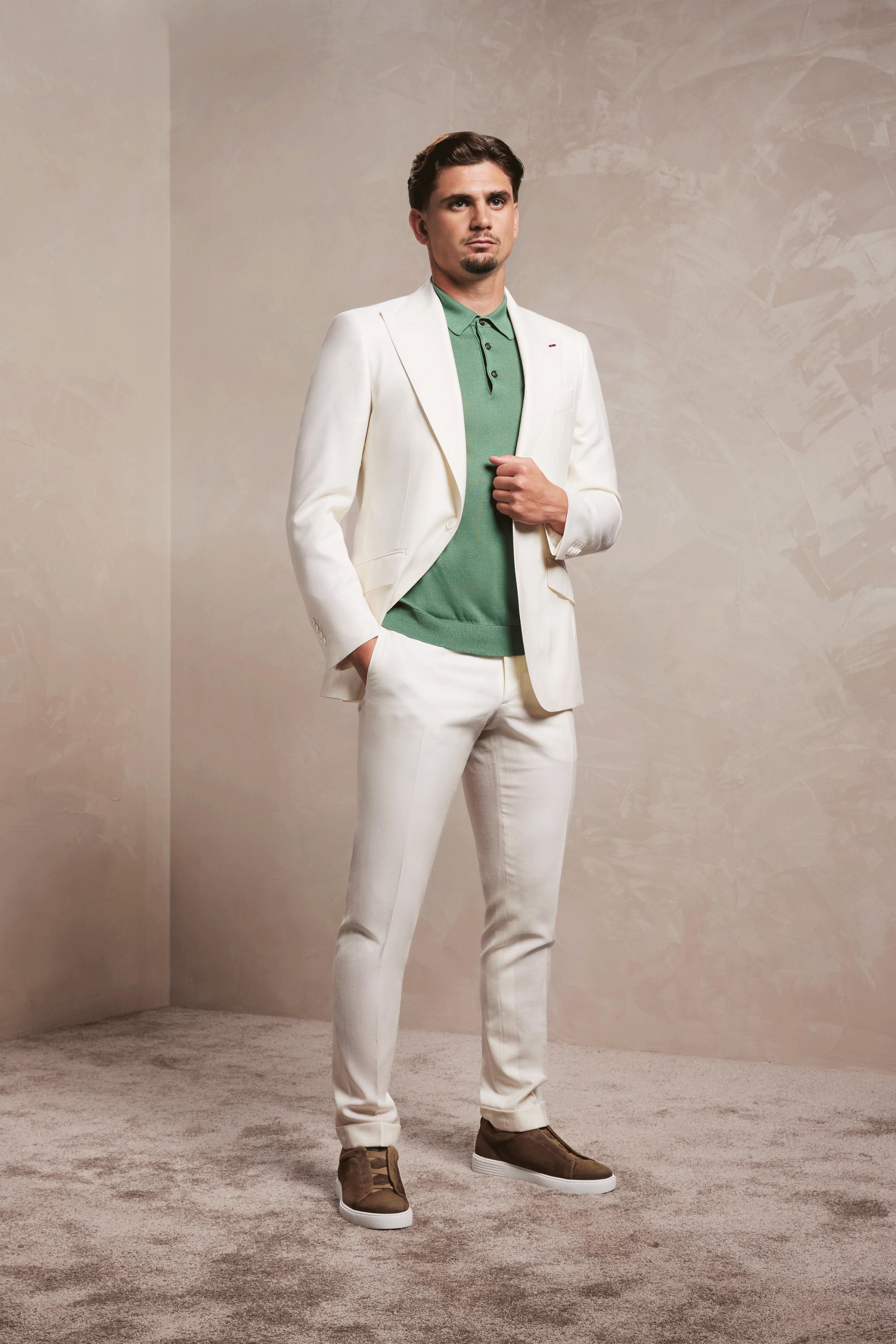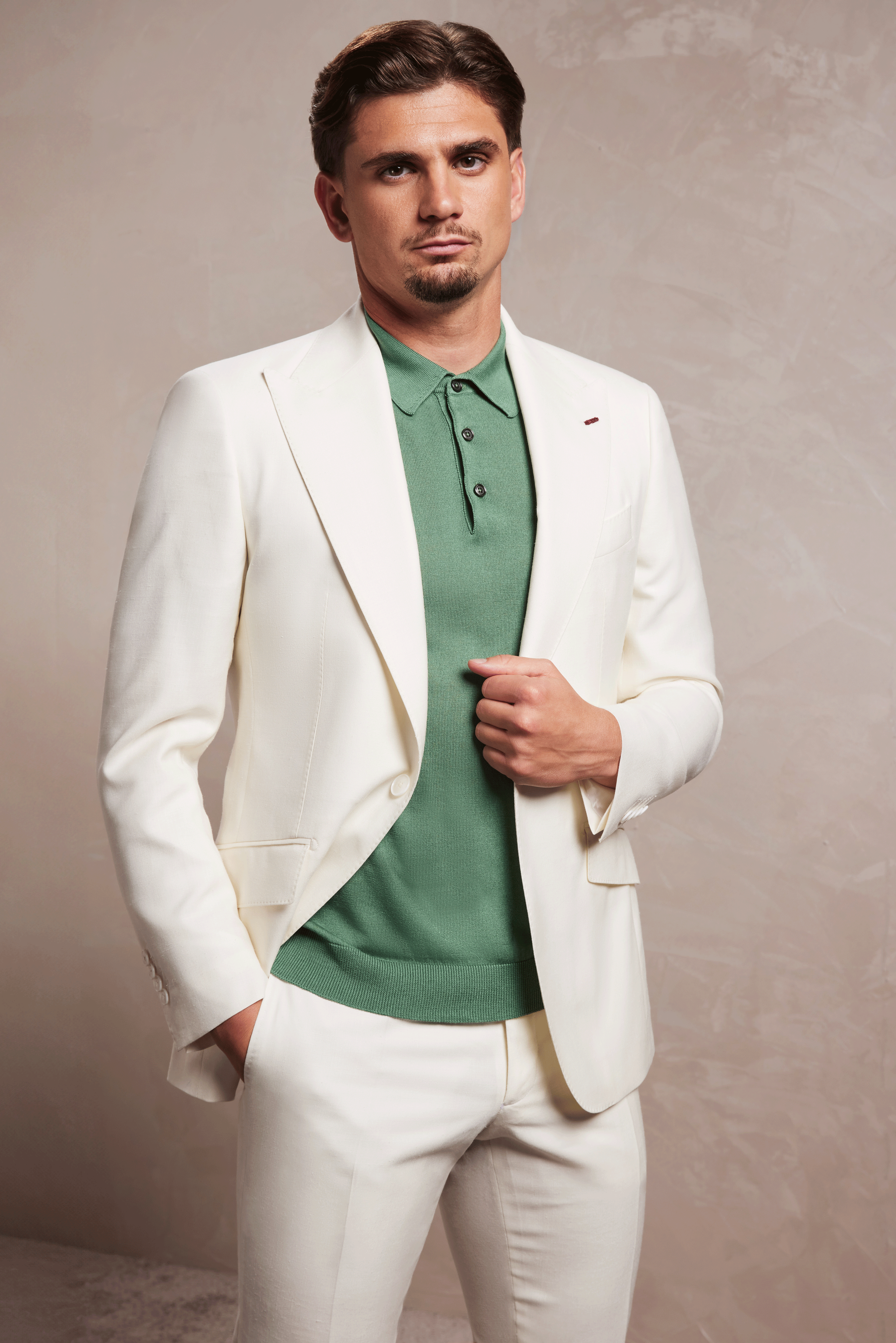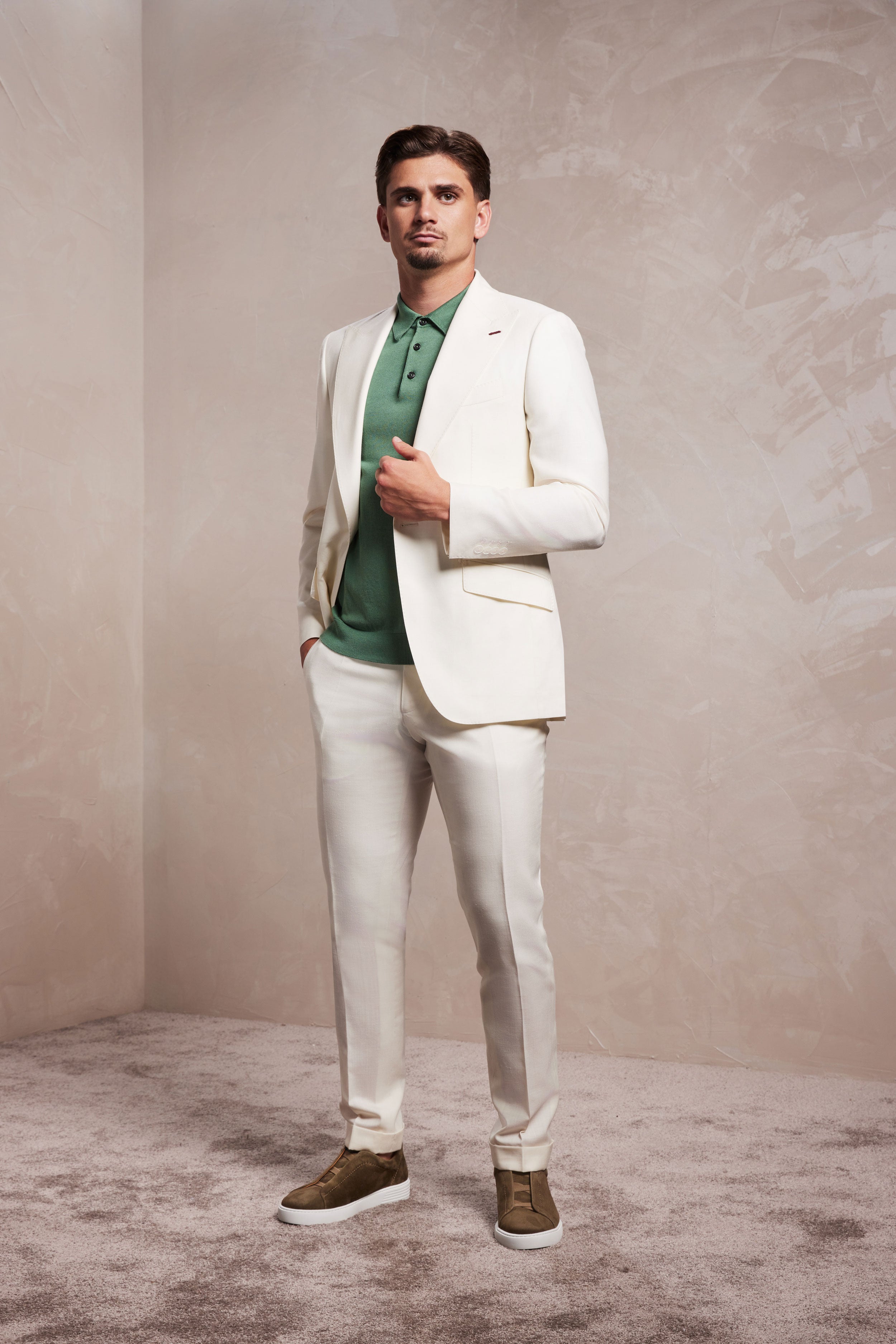 Descoperiți rafinamentul suprem al stilului relaxat cu acest costum excepțional. Croit dintr-o stofă unică Drago Super 130s lână, cu designul și compoziția stabilite de Dobre Tailoring și realizată de Drago. Compoziția de in, mătase și lână oferă o textură remarcabilă, o lejeritate inegalabilă și o cădere impecabilă. Nuanța de ivory transmite o eleganță naturală și versatilitate, fiind perfectă pentru diverse ocazii.