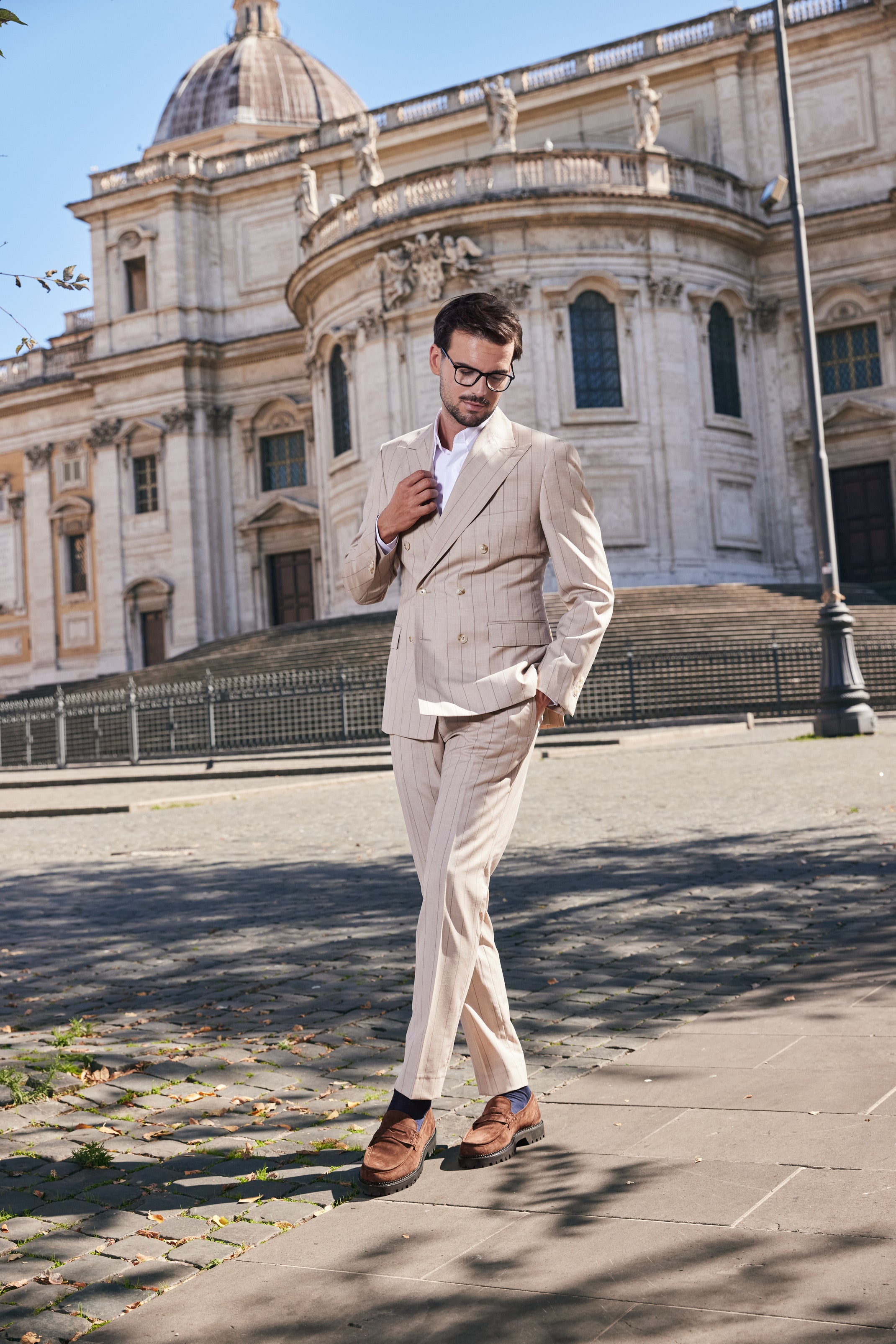Acest costum casual double-breasted, din țesătura Ermenegildo Zegna 100% lână, este alegerea ideală pentru bărbații care doresc să se remarce printr-o prezență sofisticată, păstrând totodată un stil relaxat și confortabil. Țesătura Zegna este renumită pentru finețea sa, fiind fabricată din lână de cea mai înaltă calitate, asigurând un nivel optim de confort și o rezistență naturală la șifonare. Dungile maro închis adaugă un contrast subtil și elegant, oferind o notă de distincție acestui costum casual, potrivit pentru evenimente sociale și ocazii semi-formale.