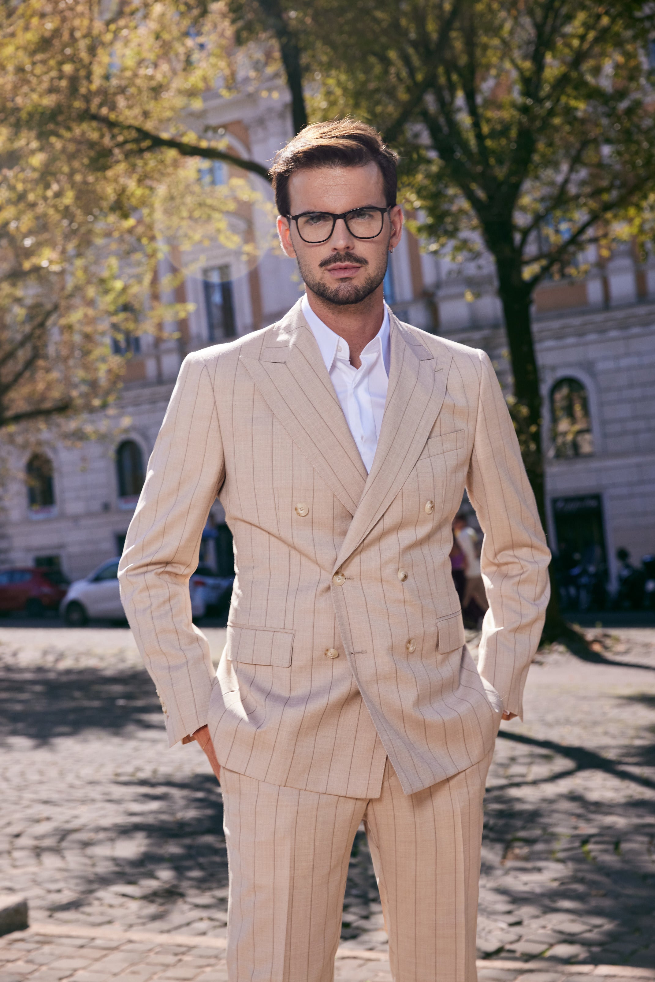 Croiala double-breasted cu două rânduri de nasturi conferă costumului un aer de eleganță atemporală, dar într-un context mai relaxat datorită nuanței de crem, fiind perfect pentru bărbații care vor să îmbine confortul cu un look bine definit.