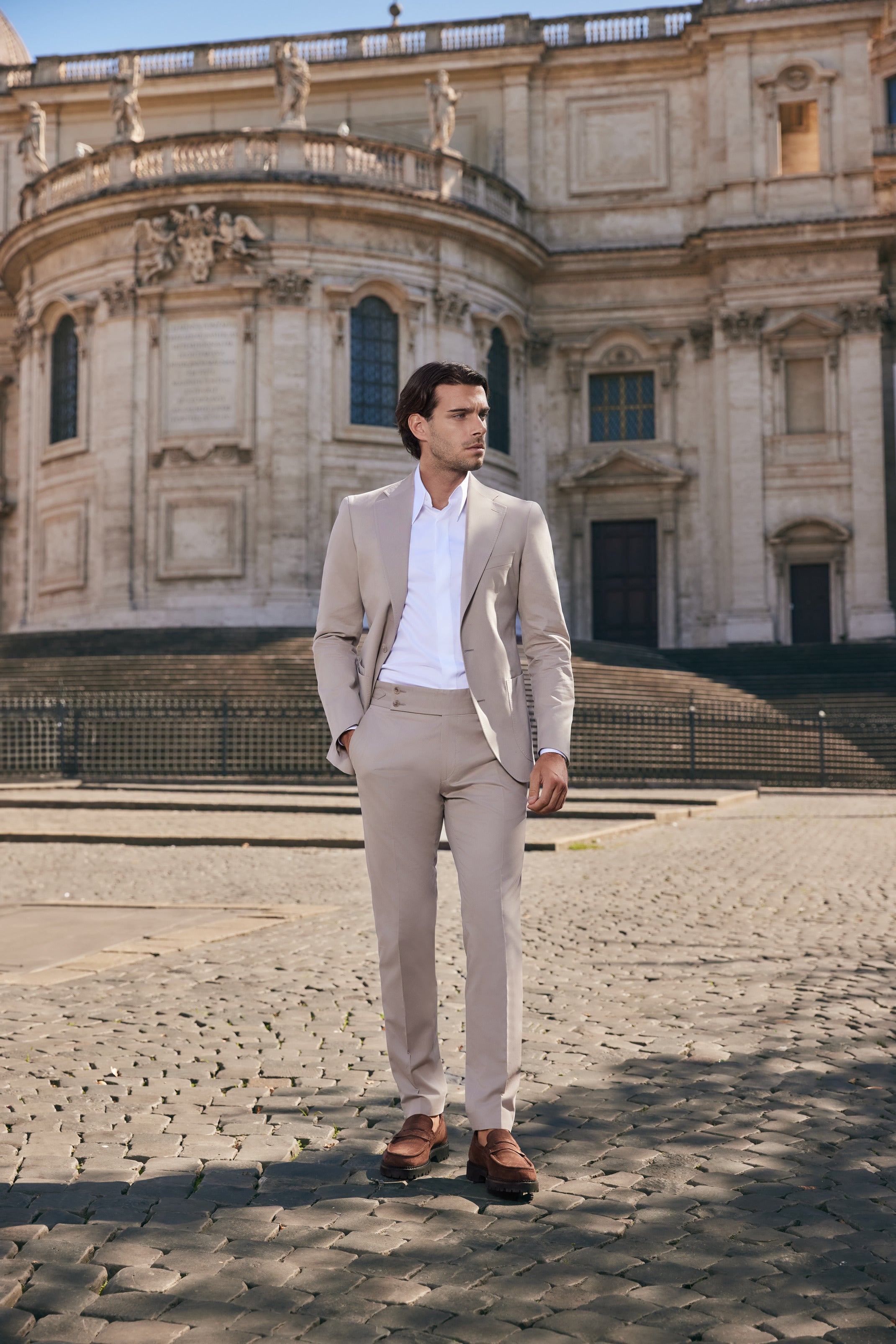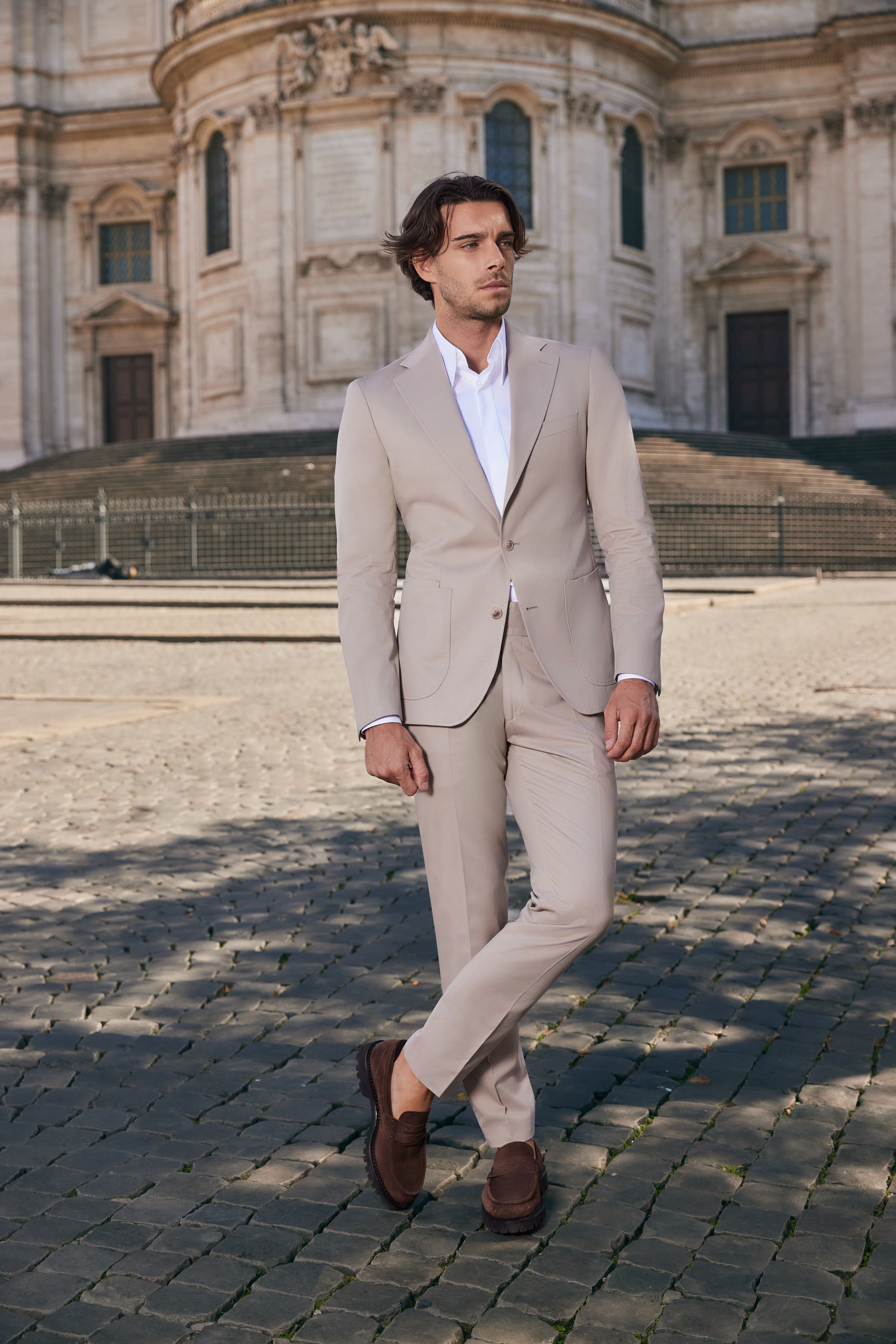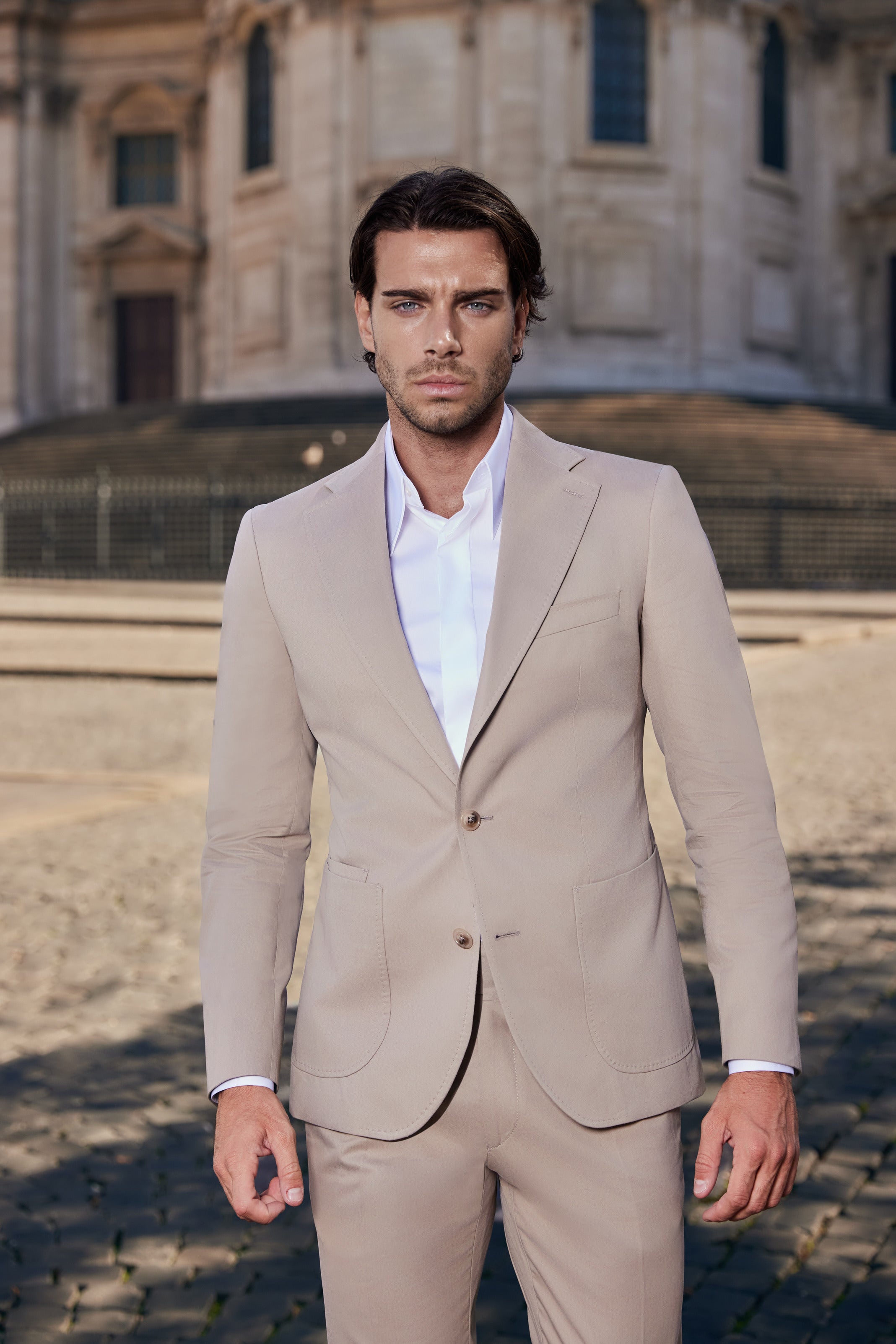 Acest costum bej, realizat din țesătura premium Cashco de la Ermenegildo Zegna (95% bumbac, 4% cașmir și 1% elastan), oferă un echilibru perfect între confort și eleganță. Materialul ușor și plăcut la atingere asigură o purtare lejeră, iar croiala modernă, cu rever clasic și buzunare aplicate, conferă un look sofisticat și relaxat.