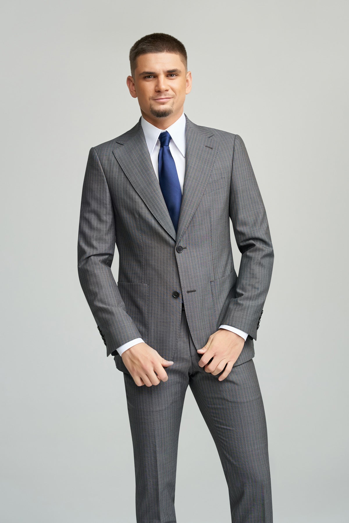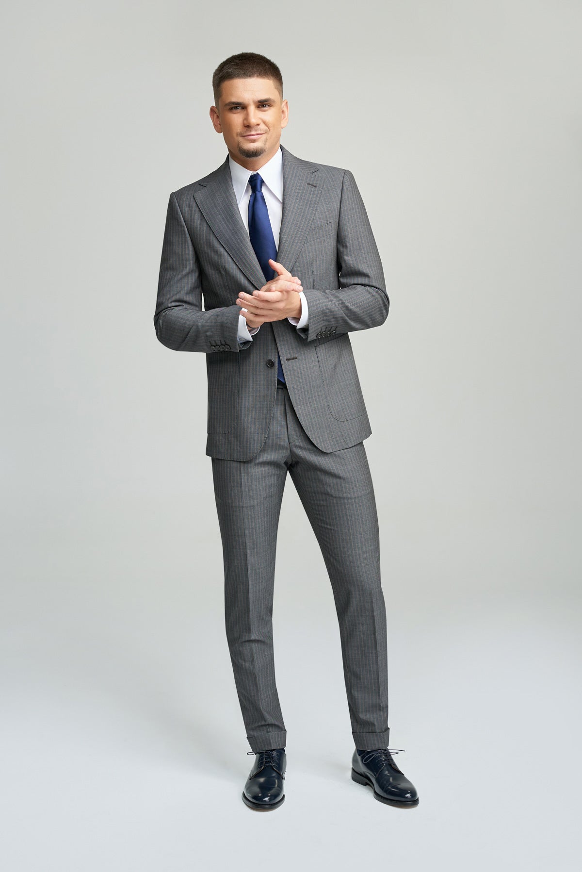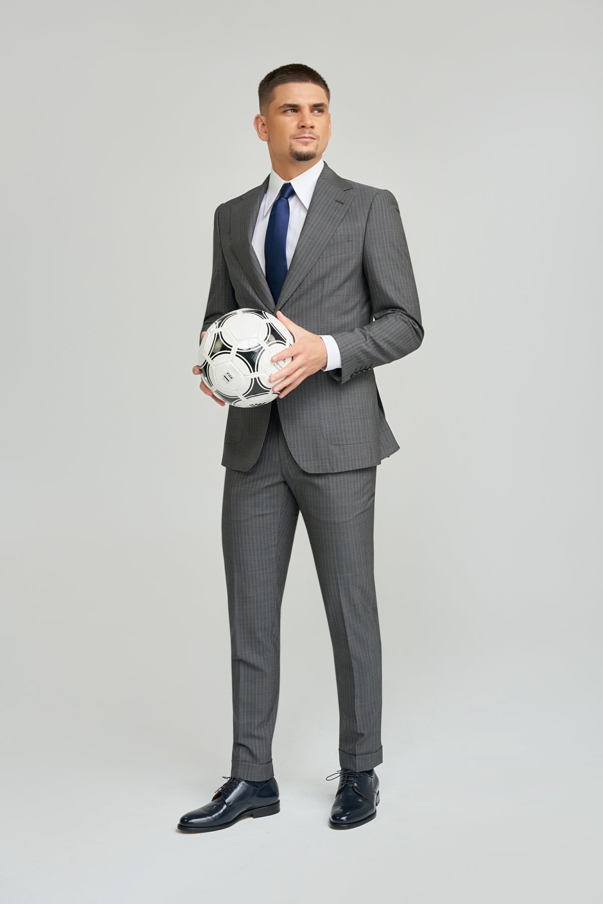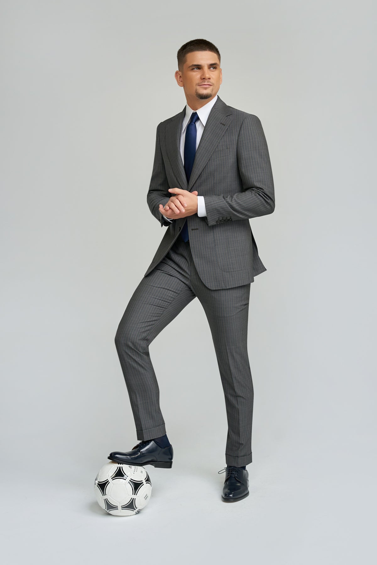 Costumul business, realizat dintr-o țesătură de calitate superioară de la Scabal, brand remarcat prin utilizarea materialelor premium și printr-o atenție deosebită la detalii, fiecare bucată de țesătură este produsă cu măiestrie în propriile sale ateliere din Yorkshire, Anglia, combinând tehnicile tradiționale cu cele mai noi inovații tehnologice.