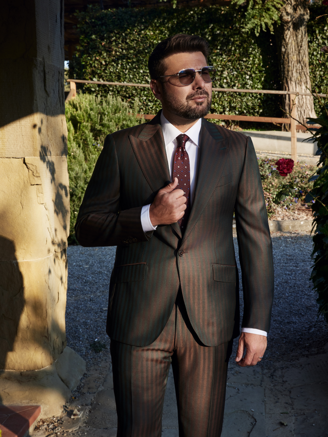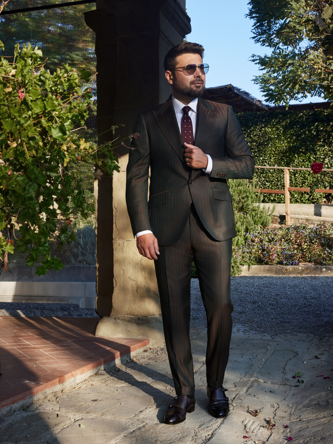 O combinație rafinată de materiale deosebite pune în valoare liniile esențiale în care este croit acest costum, completat cu nasturi din corn. Senzația plăcută la atingere și extrafină a acestui amestec natural de lână și mătase este completată de patternul Self-Stripe, care prezintă un efect subtil, nuanțat.