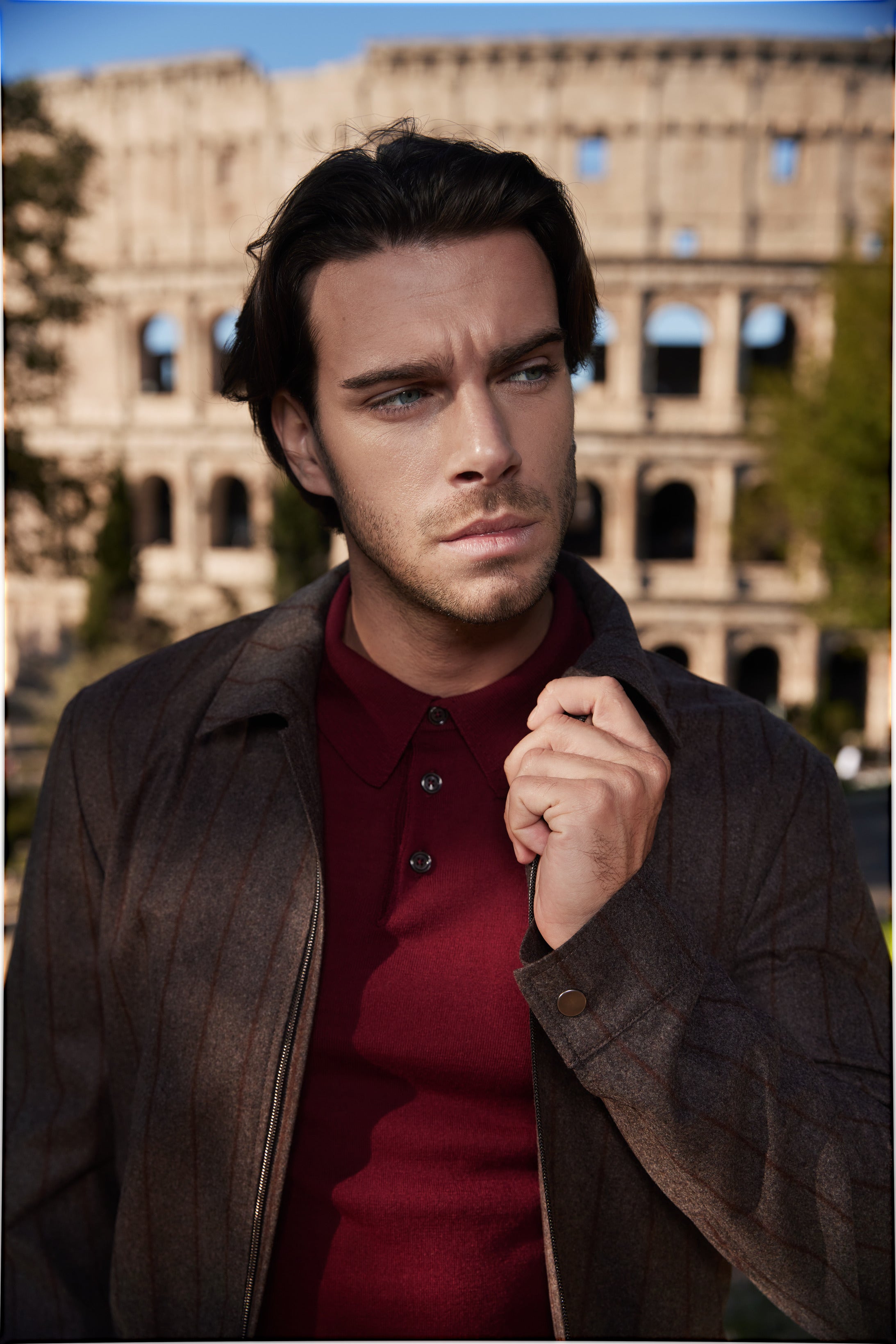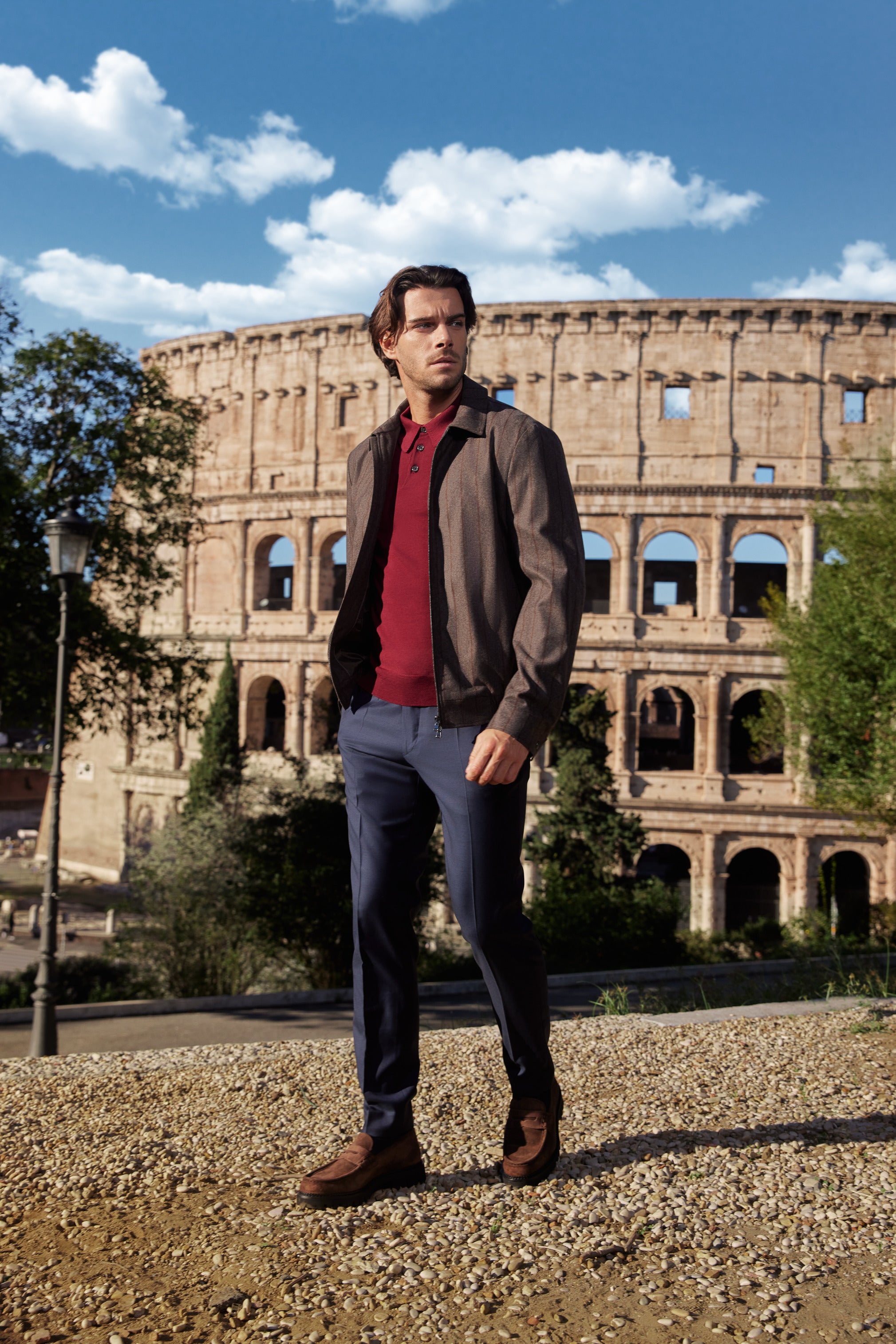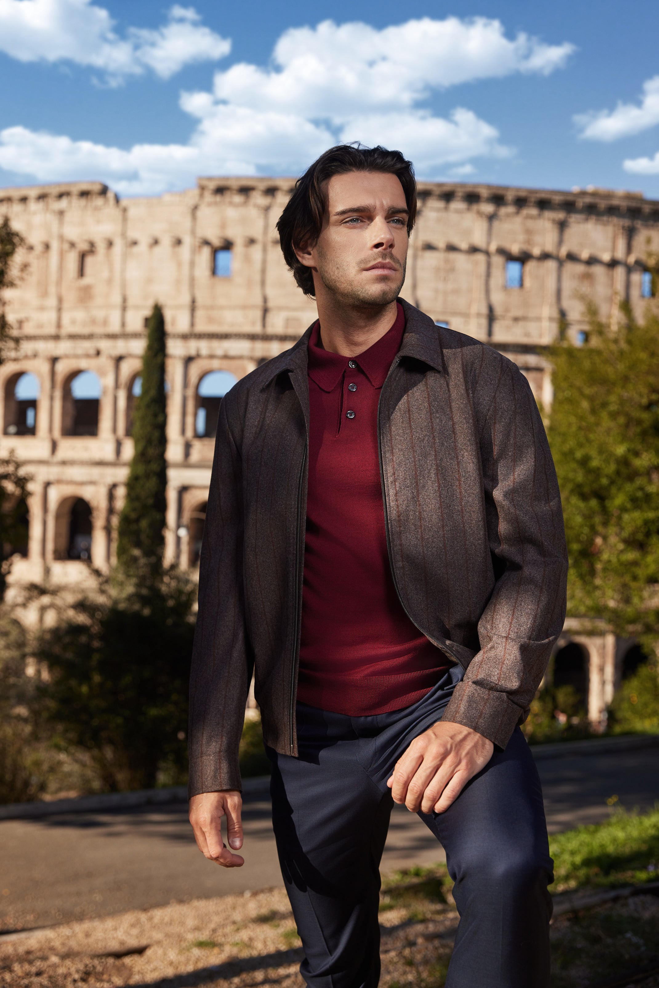 Bluzonul maro cu dungi Wool-Silk-Cashmere realizat din țesătura 14Milmil14 de la Ermenegildo Zegna, compusă din 89% lână, 6% mătase și 5% cașmir, este o piesă care combină luxul cu funcționalitatea. Această combinație oferă un echilibru ideal între confort și eleganță, iar detaliile subtile ale dungilor adaugă un plus de rafinament. Croiala minimalistă și fermoarul frontal conferă un look contemporan, perfect pentru bărbații care doresc să îmbine un stil smart casual cu materiale de înaltă calitate.