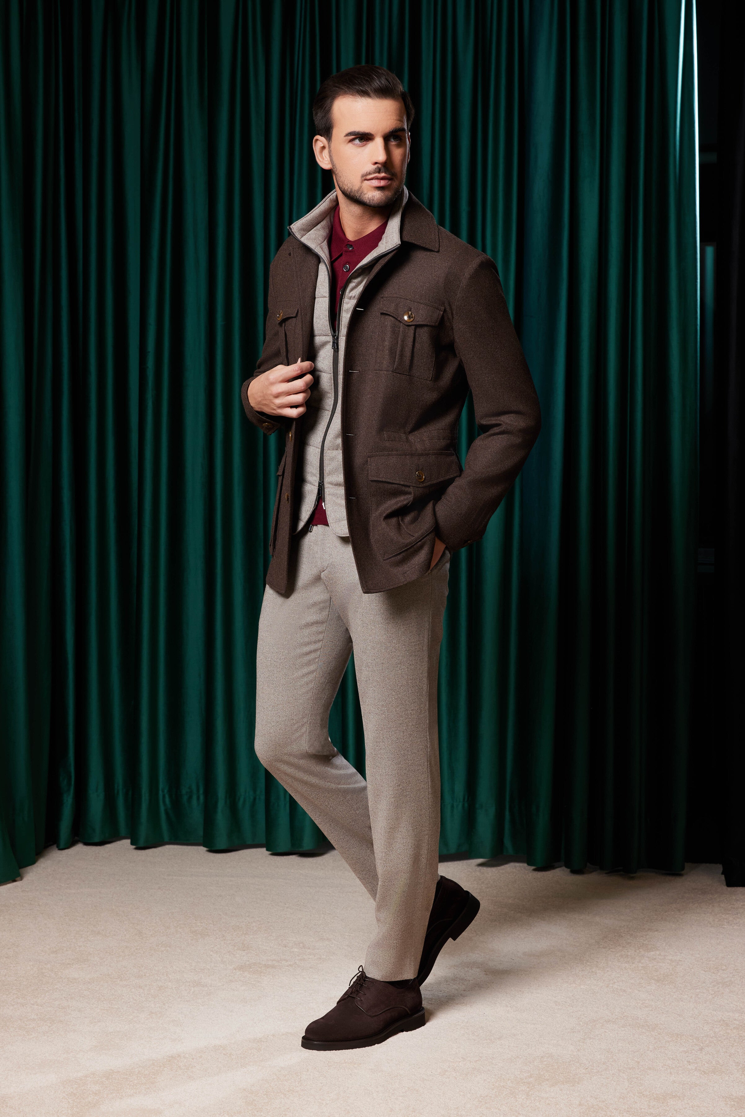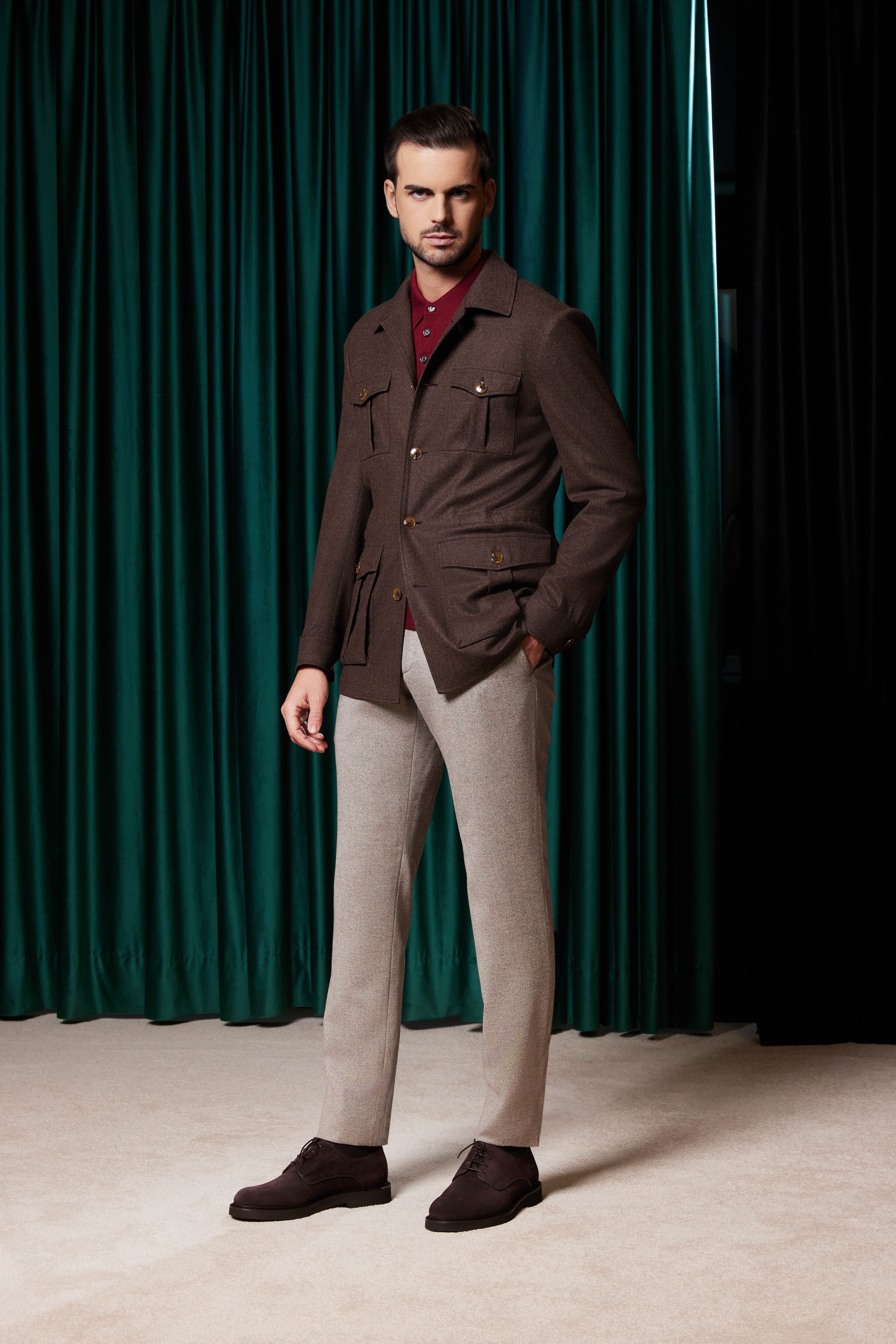 Această jachetă de inspirație Safari reprezintă un exemplu rafinat de îmbrăcăminte funcțională și sofisticată, realizată din țesătura premium Drago Rugby Flannel Super 130s. Recunoscută pentru textura sa moale și confortul remarcabil, această țesătură de excepție oferă un aer elegant și practic.