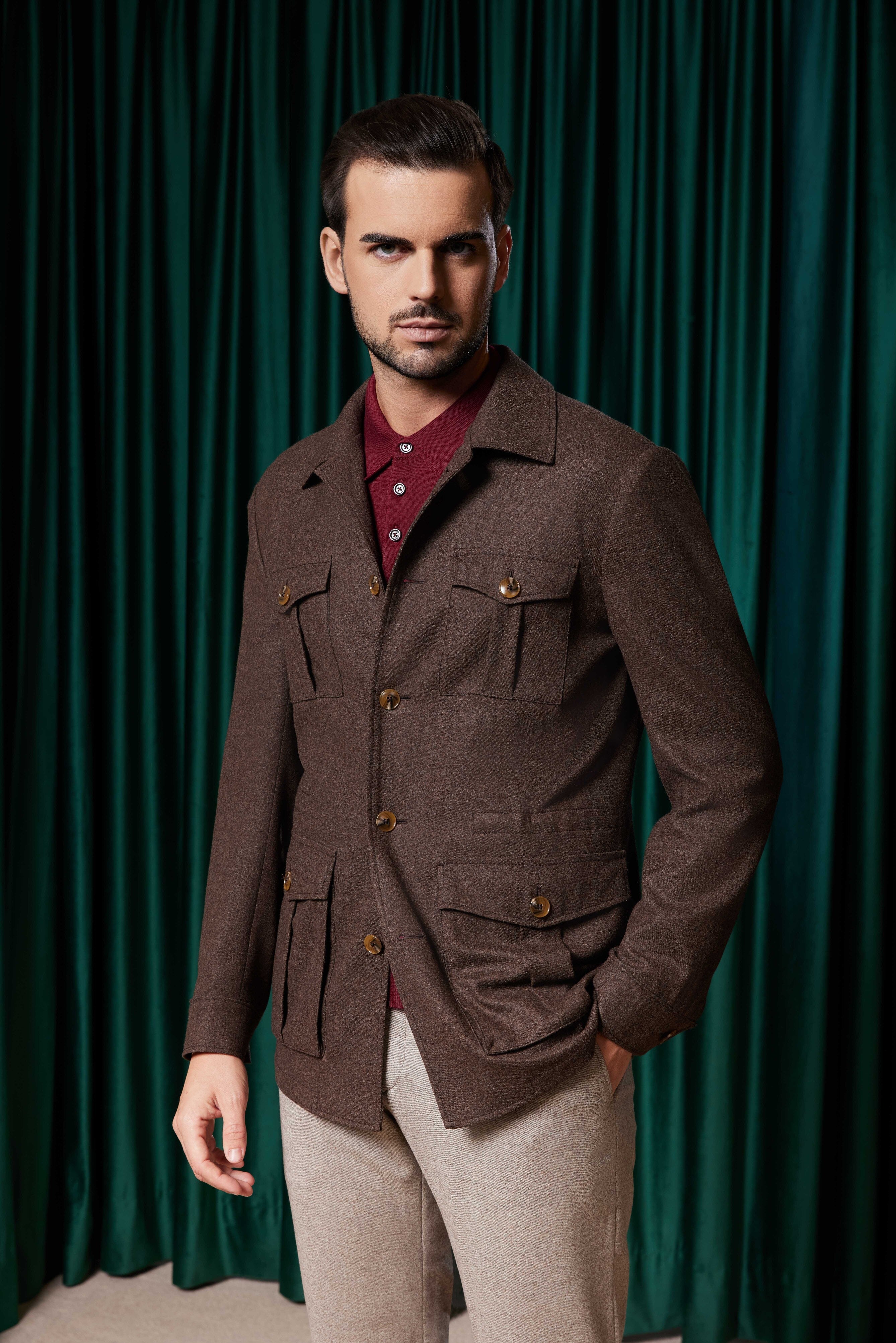 Designul său include elemente clasice de Safari, precum cele patru buzunare cu clapetă, nasturi în ton cald și croiala structurată, toate contribuind la o piesă versatilă, ideală pentru garderoba bărbatului modern. Culoarea maro închis adaugă profunzime și rafinament, făcând-o perfectă atât pentru ținutele smart casual, cât și pentru momentele în care este necesar un aspect rafinat.