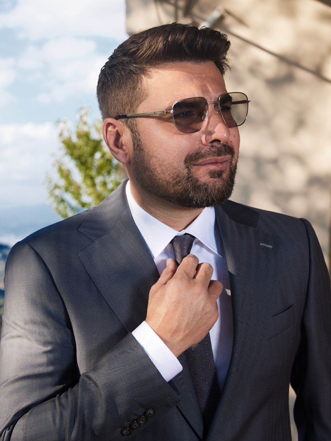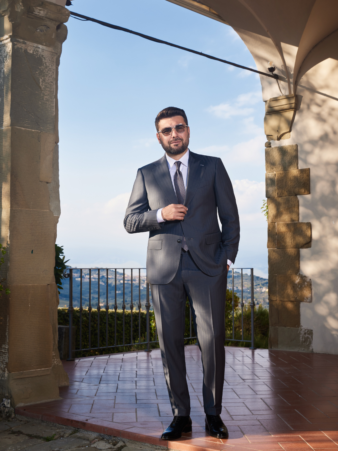 Pantalonii se disting prin betelia înaltă, o caracteristică definitorie a croitoriei clasice, menită să contureze o siluetă rafinată, fără a impune purtarea unei curele.