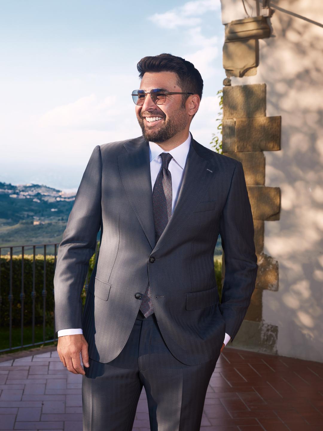 Sacoul single-breasted prezintă un rever clasic și se închide cu doi nasturi din corn. Confortul sacoului este asigurat de căptușeala integrală cupro și deschiderea dublă la spate a acestuia, iar manșetele funcționale contribuie la finisajul său elegant.
