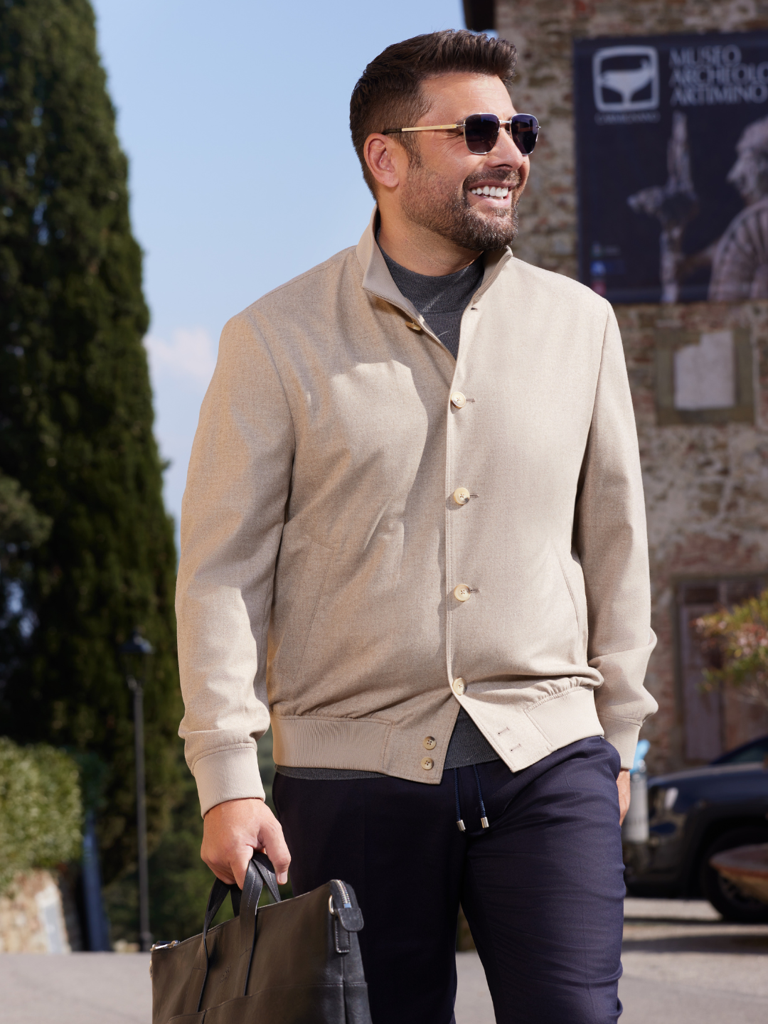 Materialele rafinate și funcționale sunt armonios combinate cu alura lejeră, dar versatilă, a bluzonului clasic. Confecționată din țesătură exclusivă Zegna 14 milmil 14, jacheta aceasta a fost creată pentru confort termic optim și un rafinament discret.