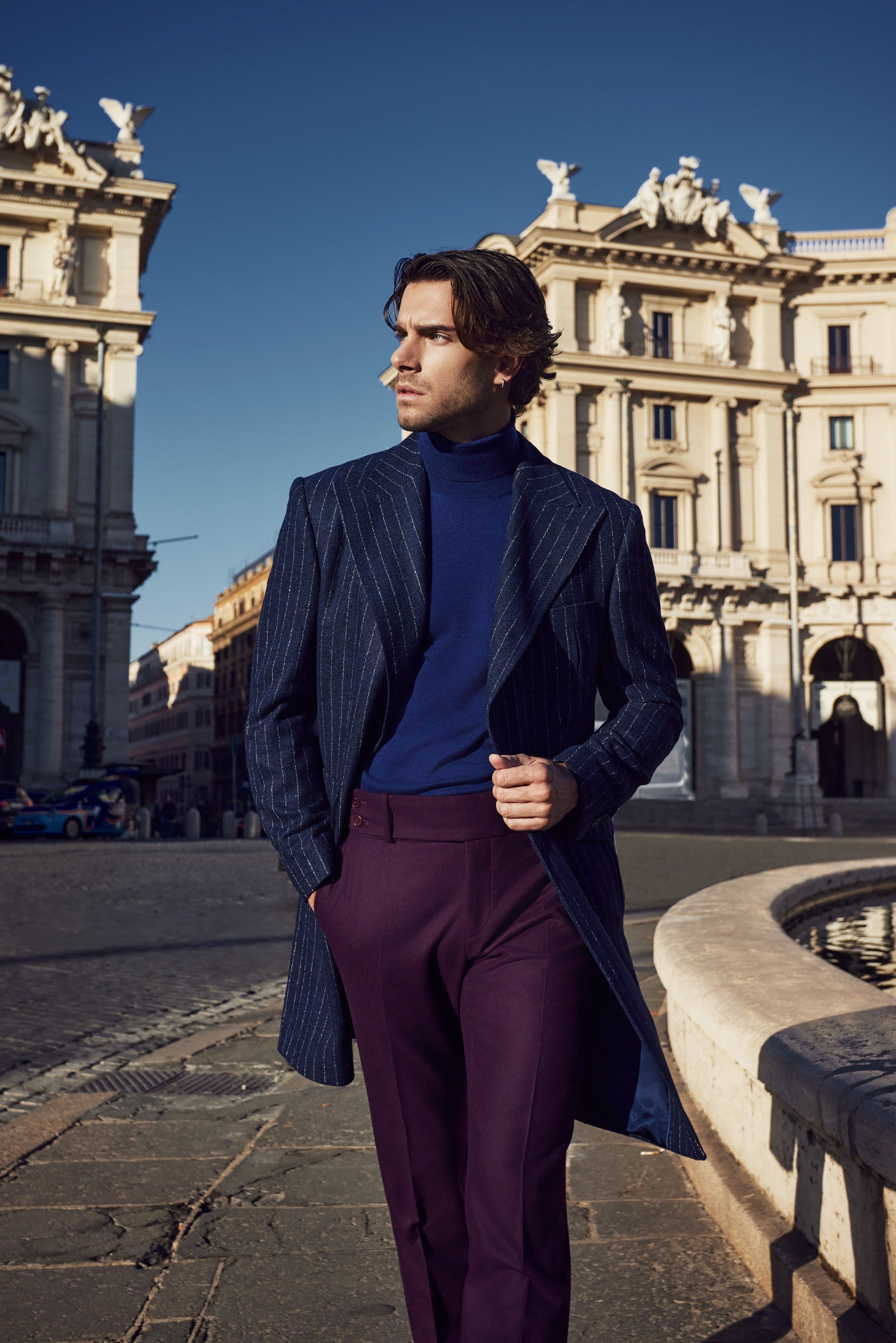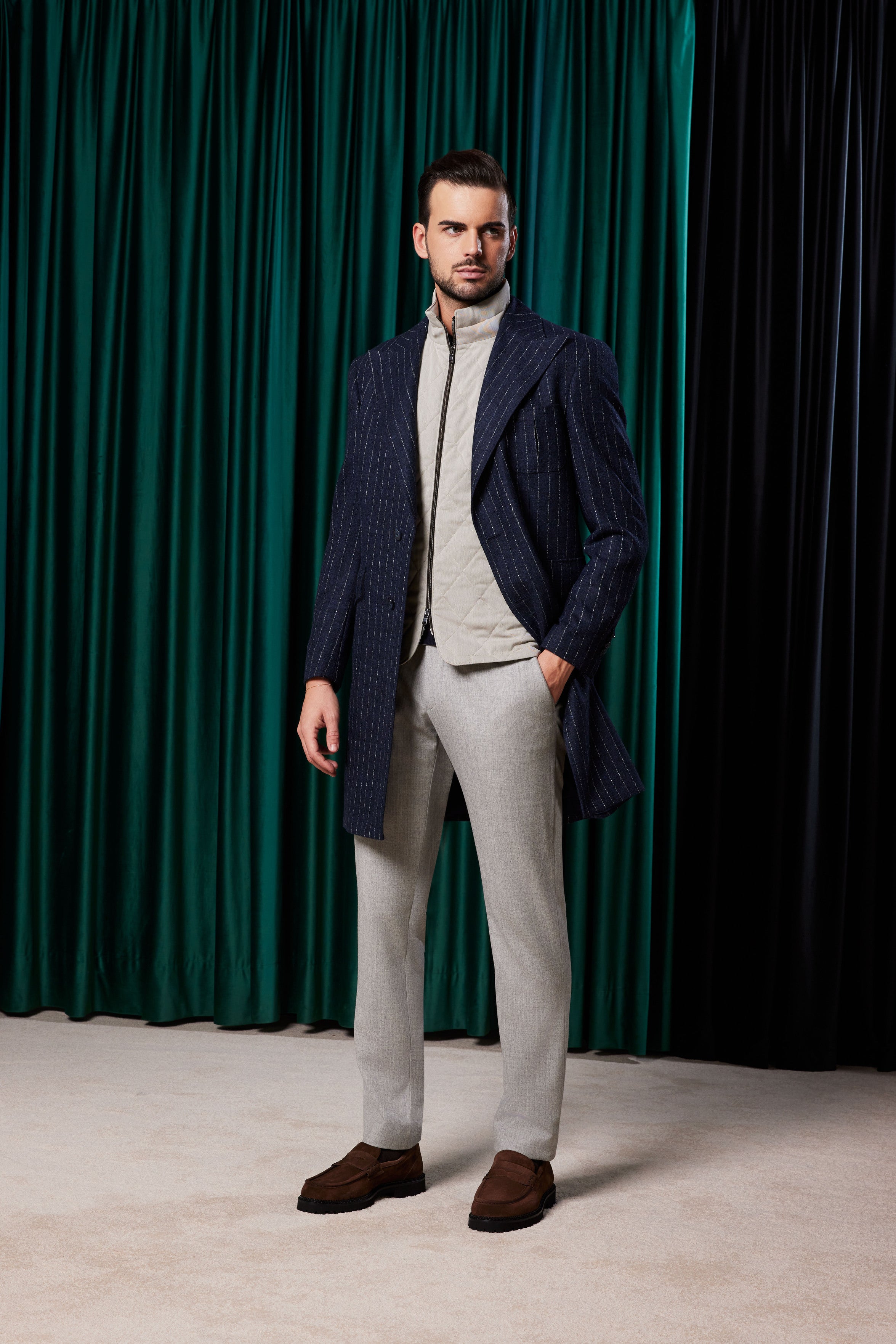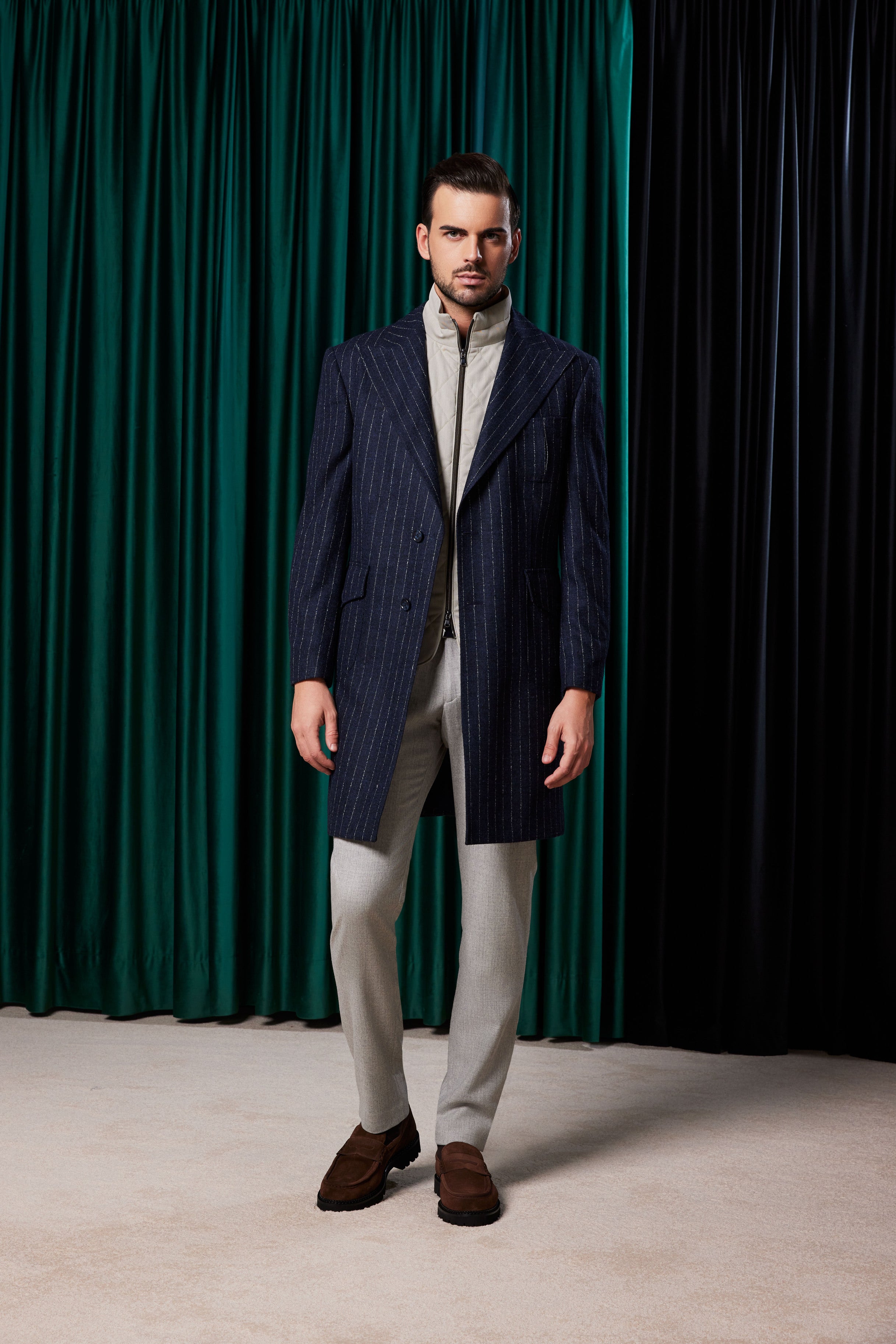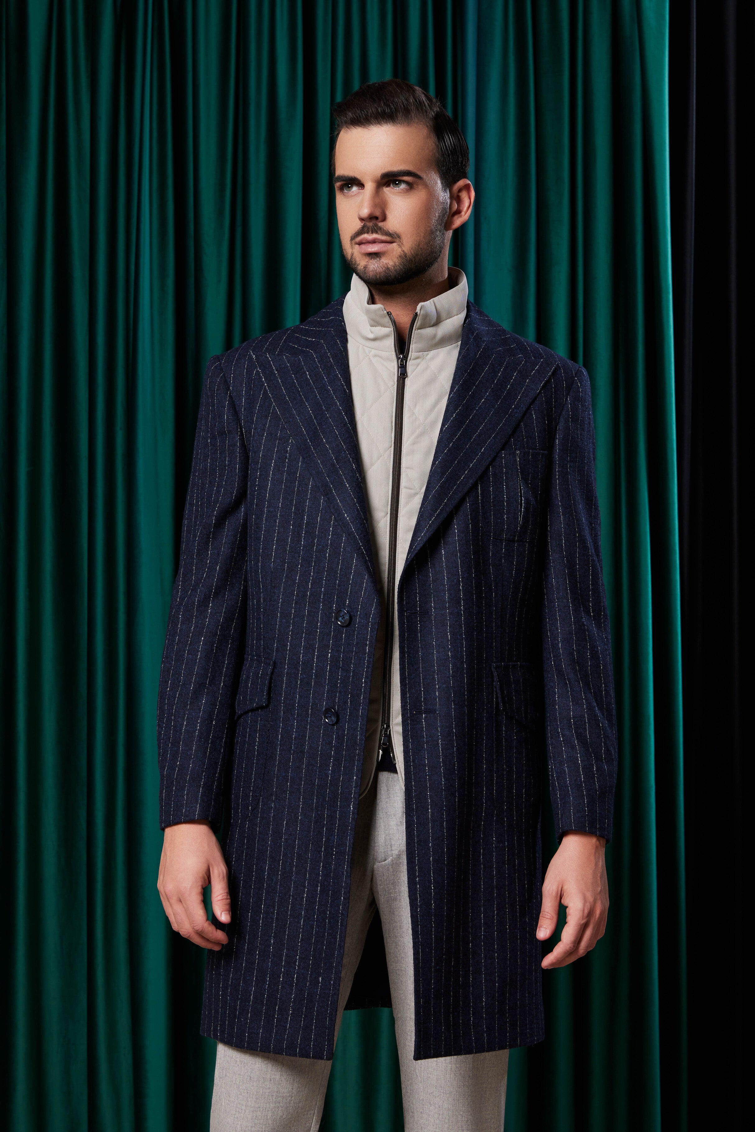 Paltonul Corviano bleumarin cu dungi albe fine din 100% lână aduce un aer casual-elegant, ideal pentru bărbații care apreciază stilul versatil. Cu un rever ascuțit și o închidere la doi nasturi, acest palton poate fi purtat atât cu jeans pentru un look relaxat, cât și cu costum pentru ocazii mai formale. Buzunarele aplicate completează designul practic, transformându-l într-o piesă indispensabilă în orice garderobă.