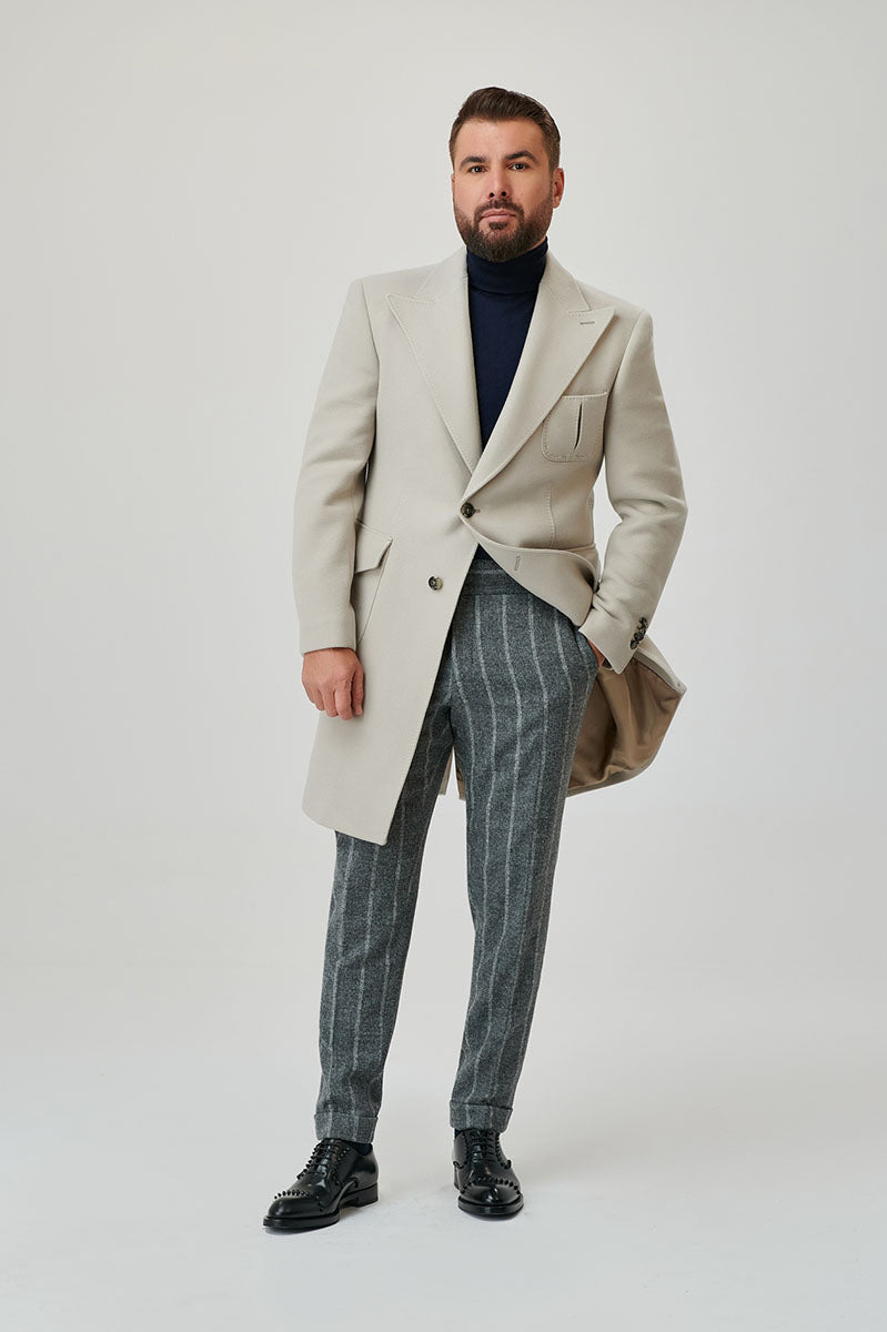 Paltonul masculin din colecția de toamnă, Orazio, în nuanța de gri oyster, este fabricat din cașmir și lână Ermenegildo Zegna, fiind alegerea perfectă pentru bărbații care apreciază calitatea superioară și eleganța subtilă.