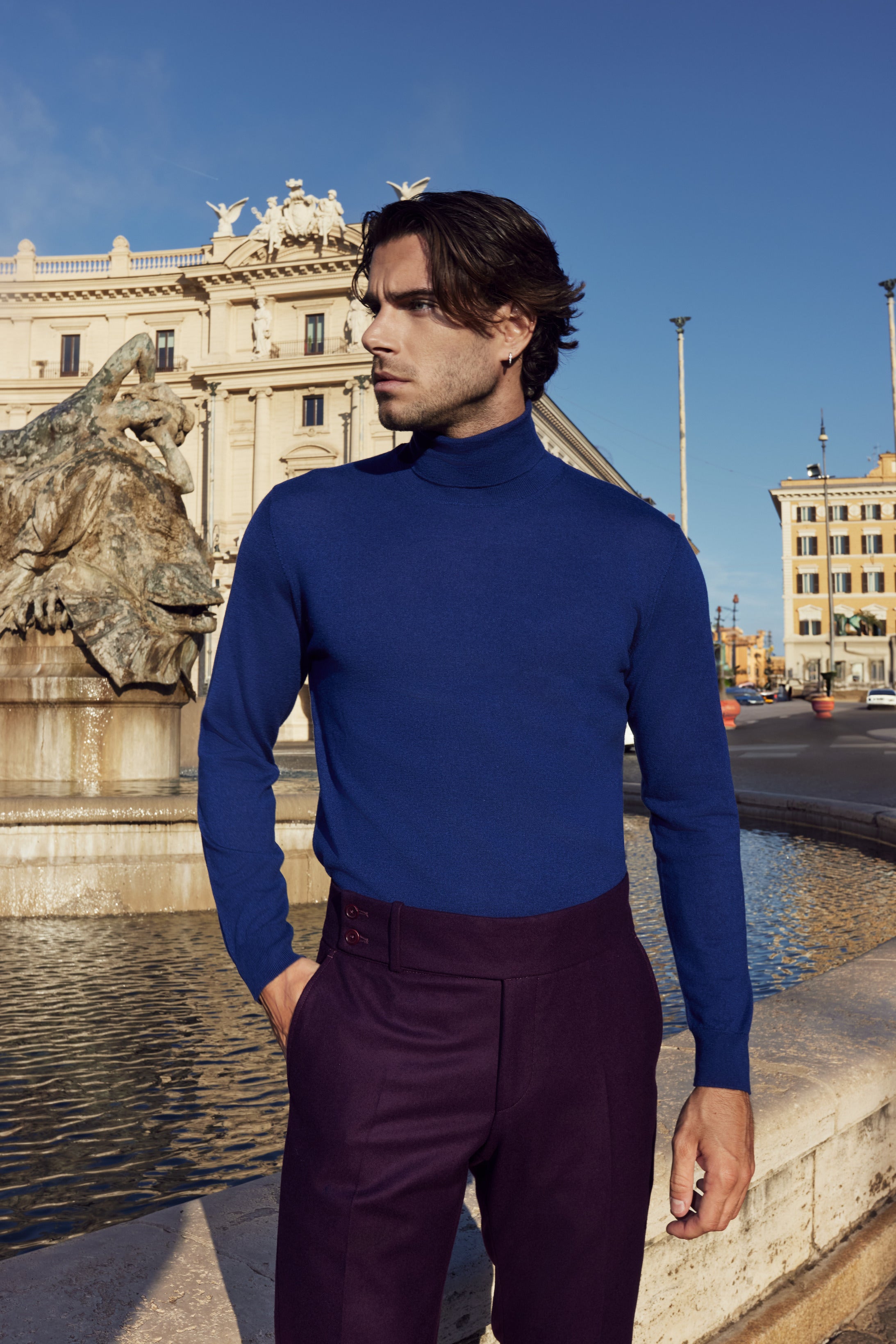 Nuanța intensă de albastru regal și gulerul înalt adaugă o notă sofisticată acestui pulover, făcându-l ideal pentru ocazii speciale sau pentru a aduce un plus de stil unei ținute cotidiene. Croiala slim fit conturează silueta într-un mod elegant, făcând din Royal Turtleneck Luxe alegerea perfectă pentru bărbații care prețuiesc calitatea și rafinamentul.